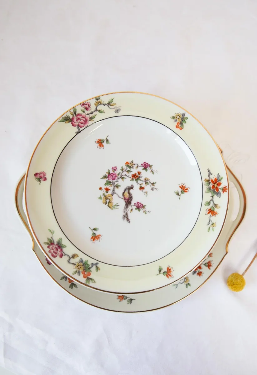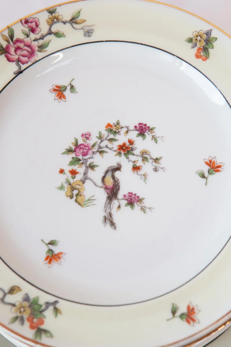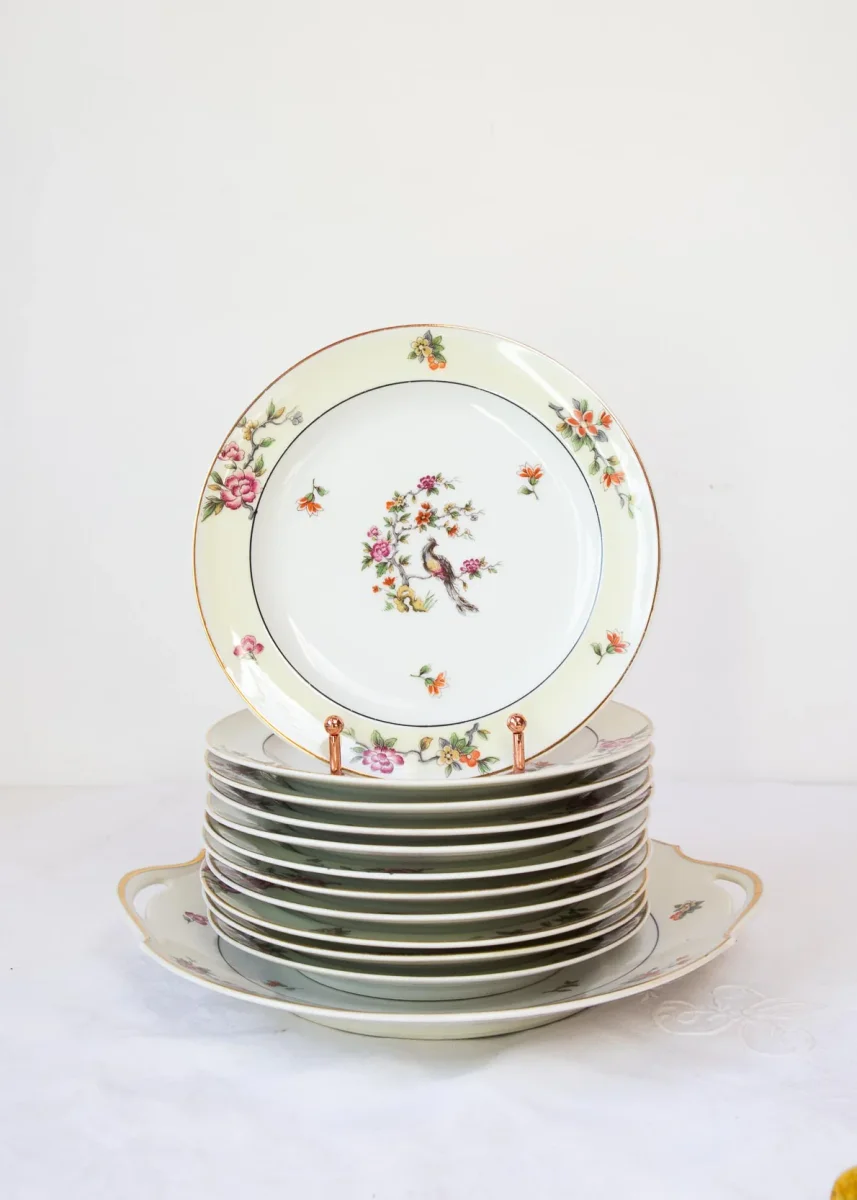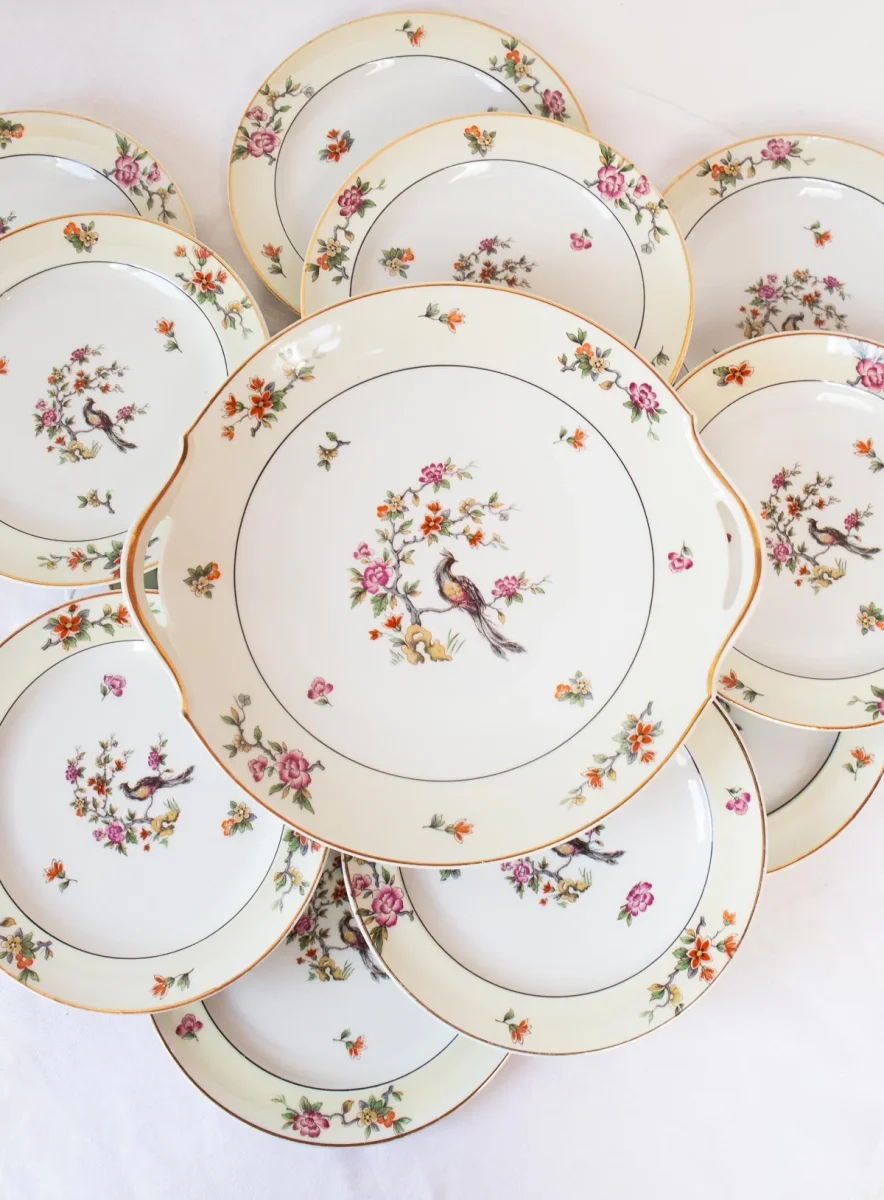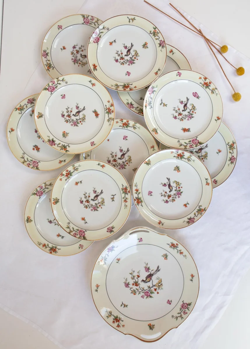 Un precioso juego de postre de porcelana Limoges de la prestigiosa fábrica limusina A. Lanternier & Cie con un motivo central con ave del paraÃso y un detalle en color amarillo pálido en el borde. El juego está formado por 11 platos de postre y una fuente.