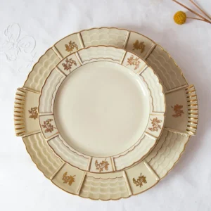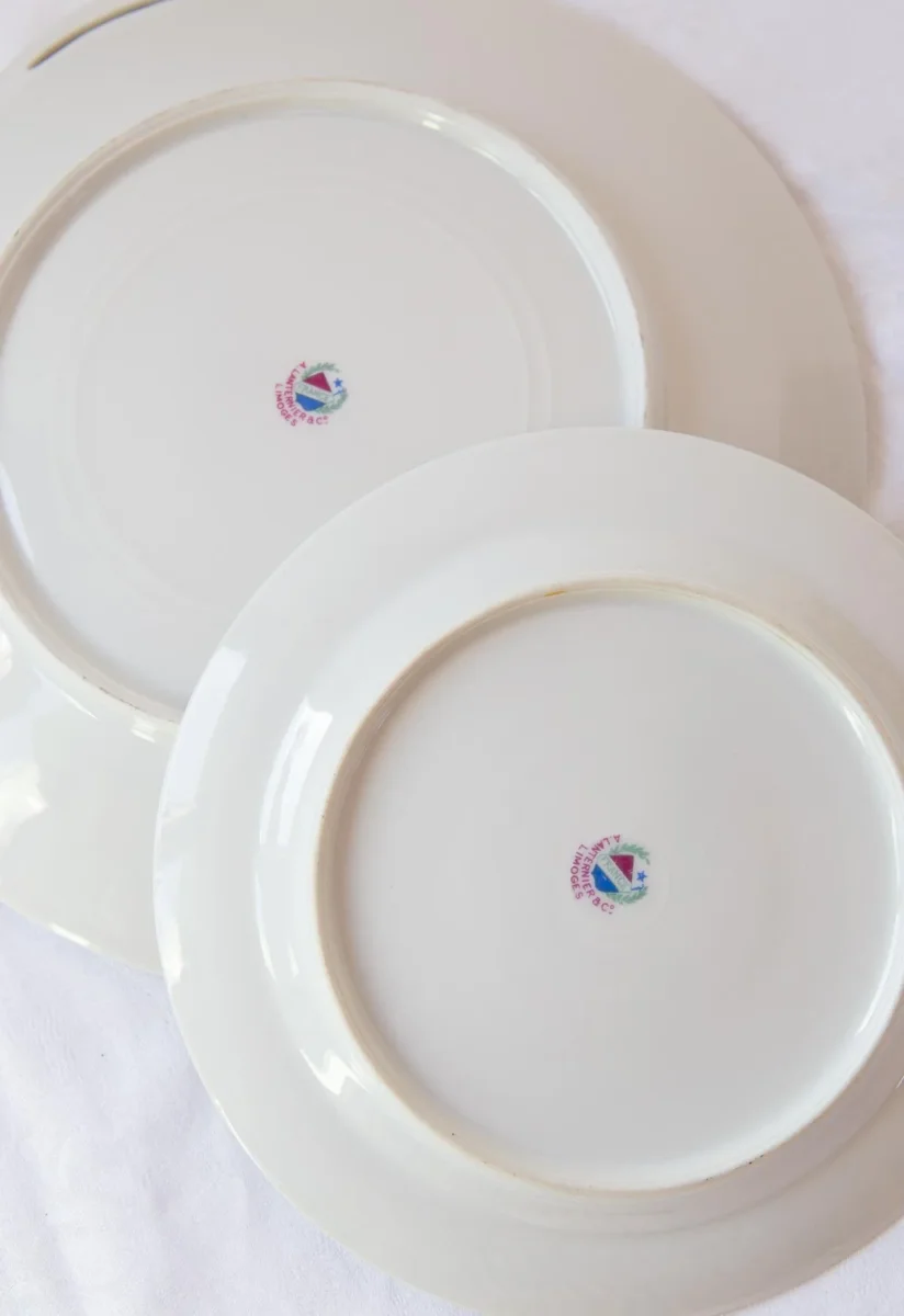 Antique French Limoges «A. Lantenier» dessert set. c. 1910. 12 pieces (11 plates and 1 dish). Dimensions: ⌀ 19,5 cm (plates), 29*26,5 cm (dish). No chips or cracks. Shipping costs will be added at checkout.