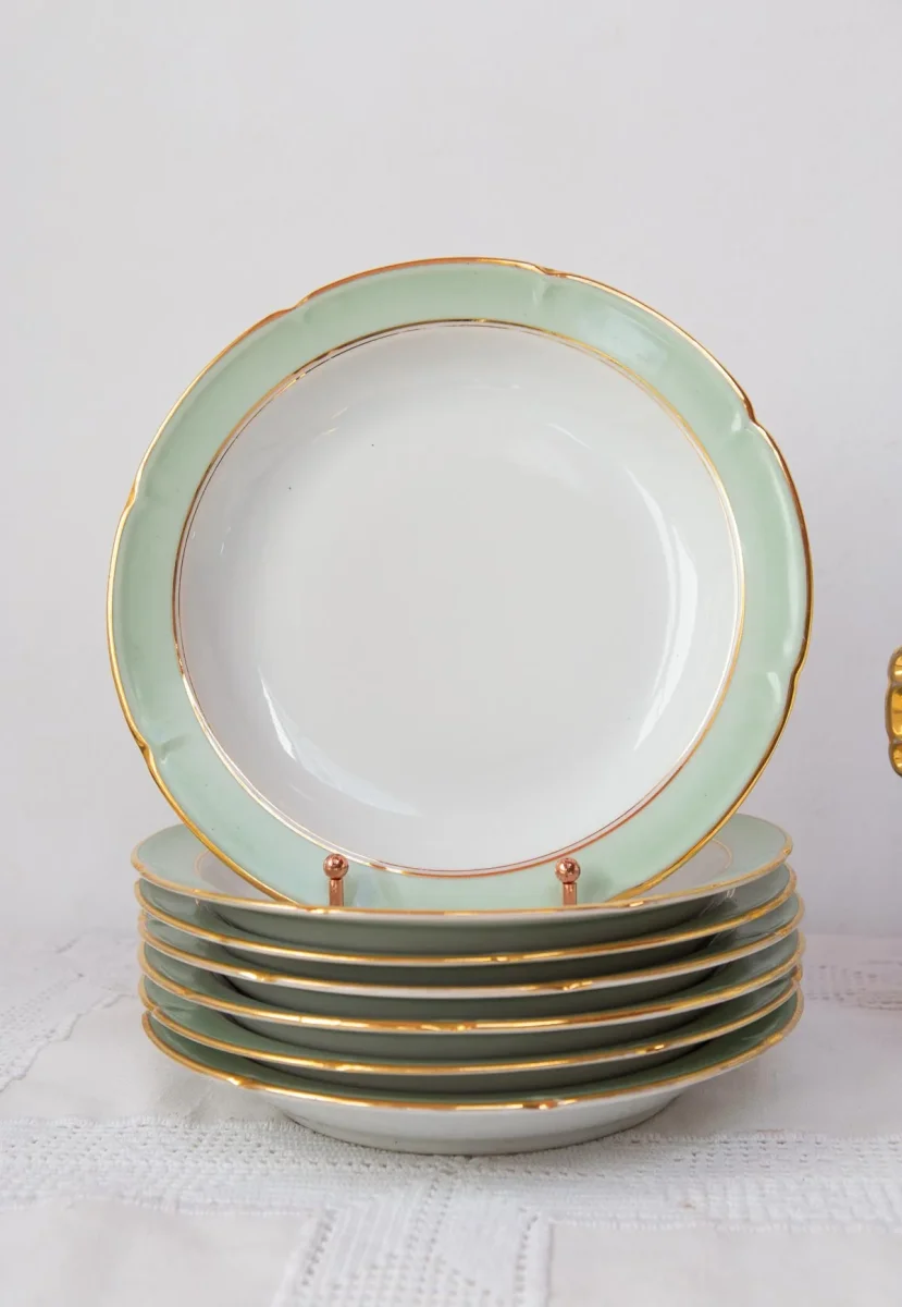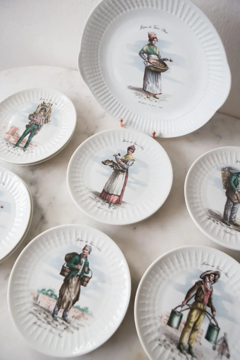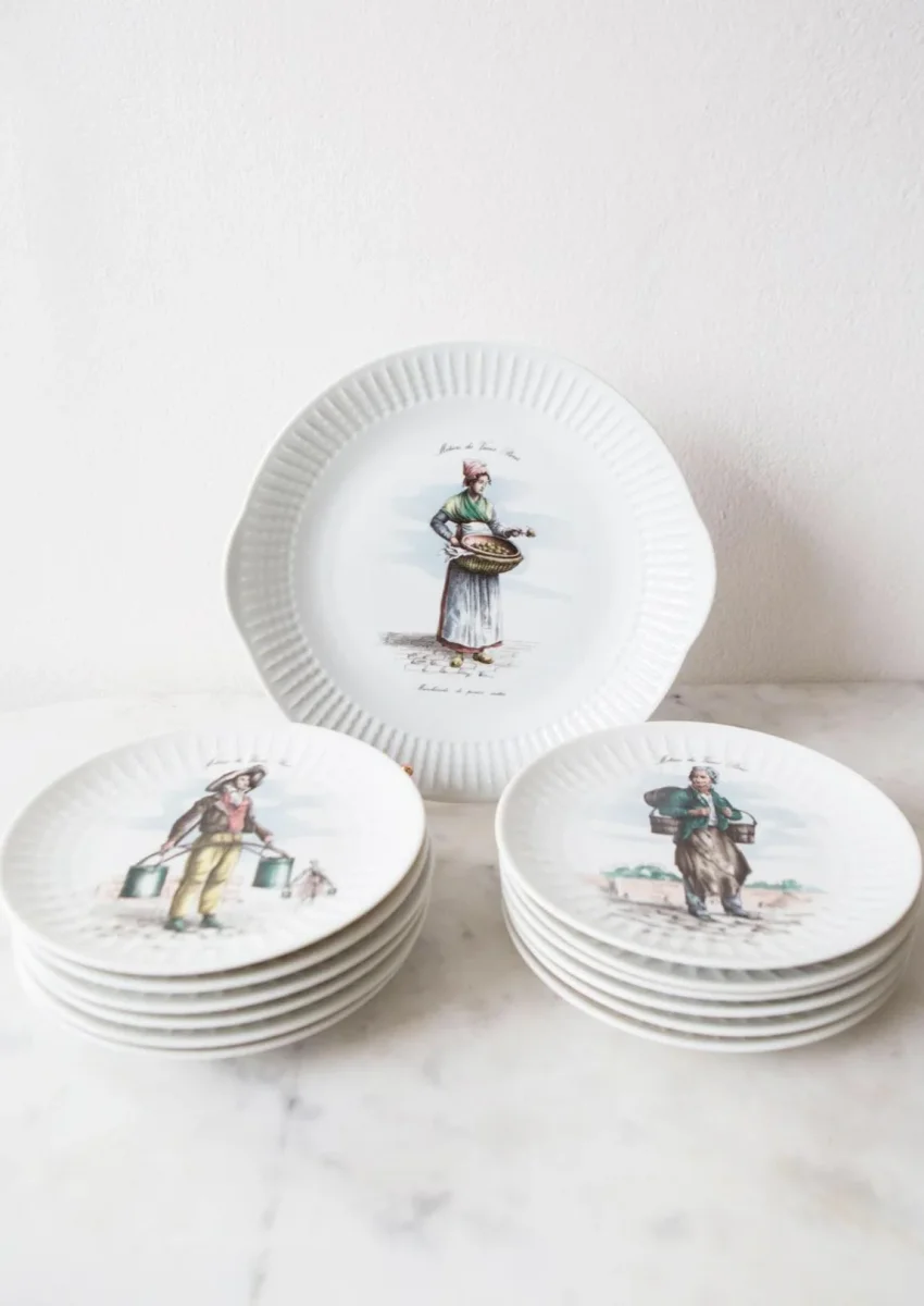 French vintage dessert service representing old parisian workers. Mint condition. 13 pieces (12 plates + 1 serving dish). Dimensions: ⌀ 19,5 cm. Shipping costs will be added at checkout.