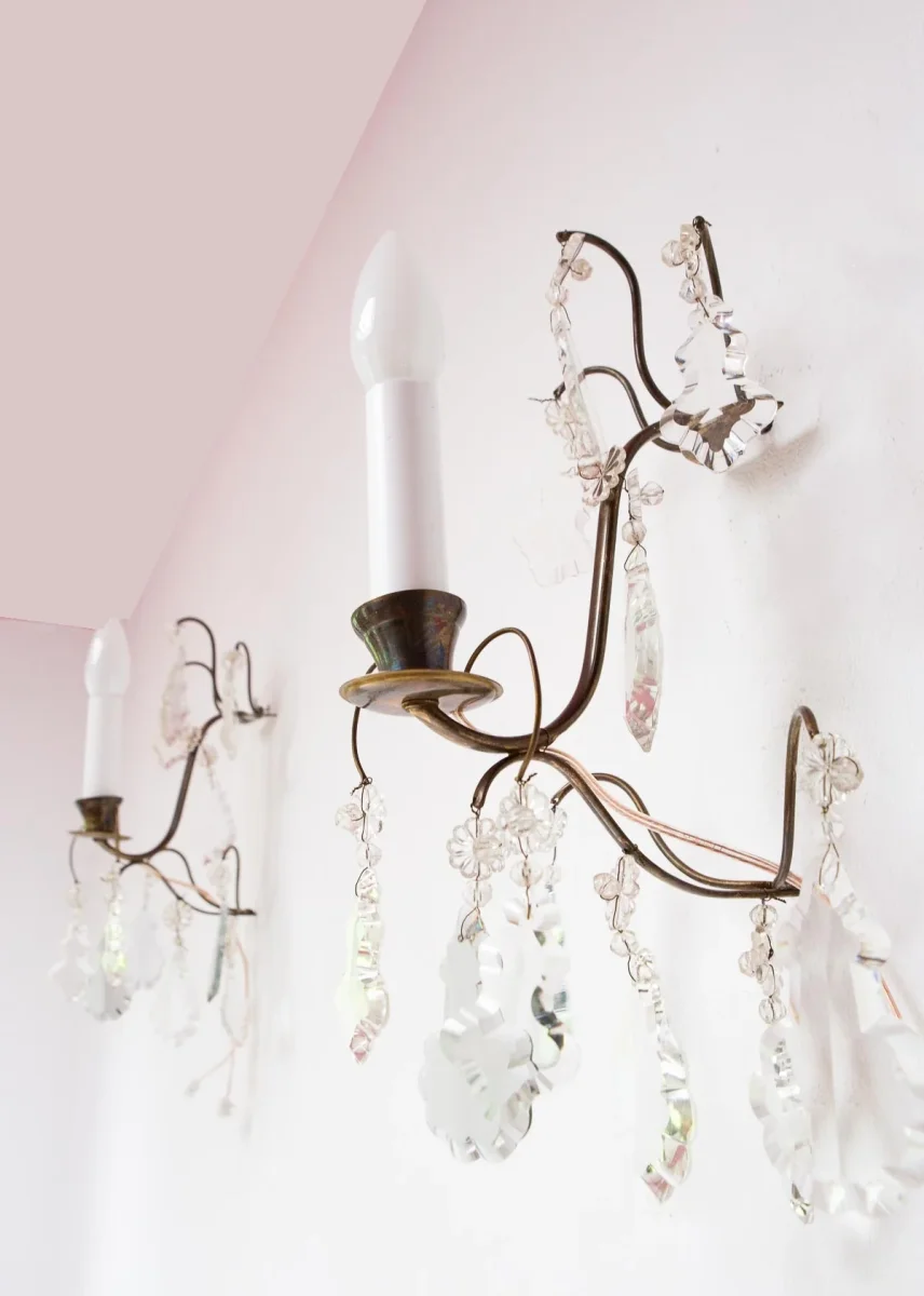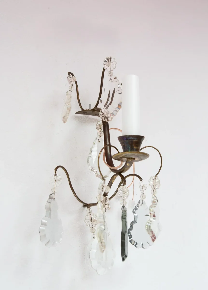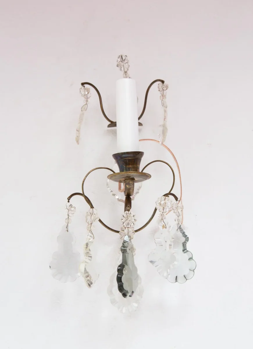 Pareja de apliques suecos de pared (o portavelas) en latón patinado con cristales de la segunda mitad del s. XX, posiblemente años 80. Los caireles de cristal son de tres tonalidades. PRECIO DE LA PAREJA