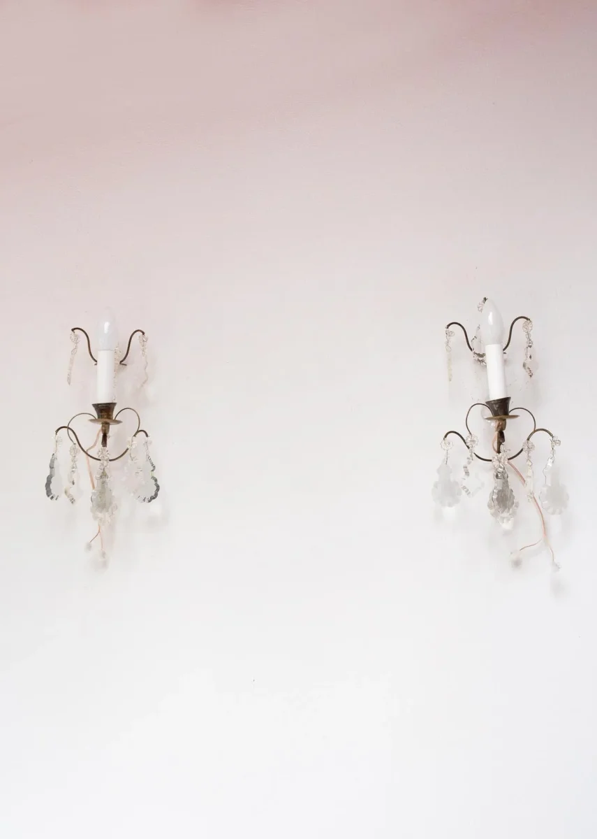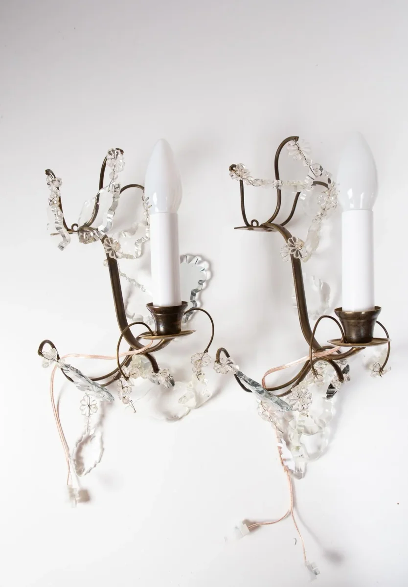 Paire d’appliques suédoises en laiton et pampilles. Pour une ampoule E14 chacune. Dimensions totales: 35 cm haut; 20 cm large, 17 cm profond. Les frais d’expédition seront ajoutés dans le panier.