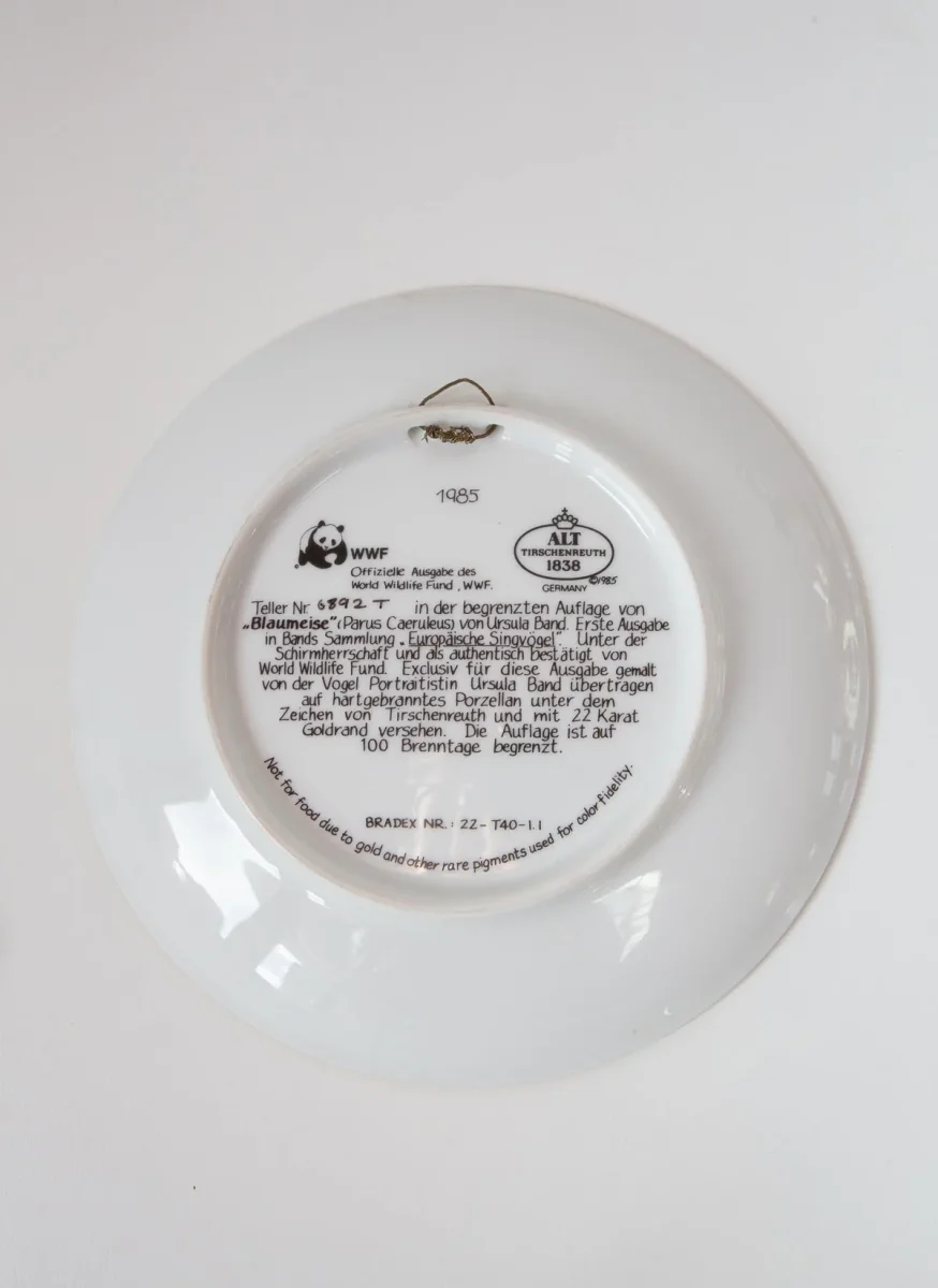Plato decorativo en porcelana alemana de Tirschenreuth. Pertenece a una colección de platos de “pájaros cantores europeos” editados en 1986 y basados en los dibujos de la pintura naturalista Ursula Band, y editados por la ong WWF (World Wildlife Fund). Todos los platos están numerados y llevan toda la información en la trasera.