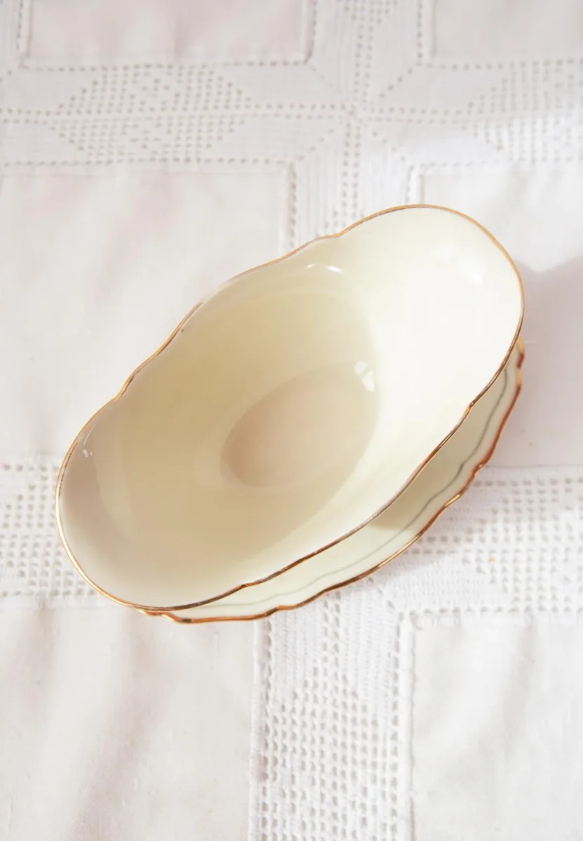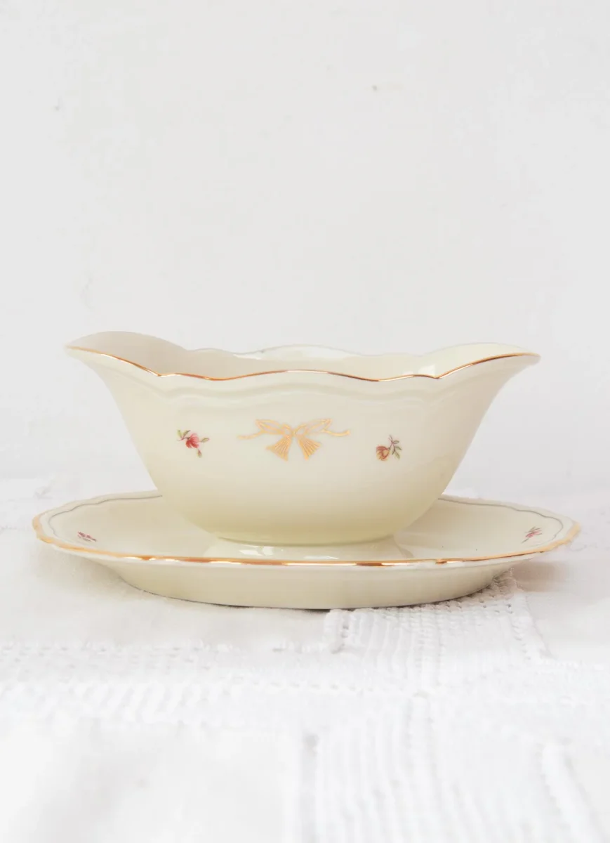 Salsera en porcelana sueca de la prestigiosa firma Hackefors en color beige con ribete dorado y un delicado motivo de flores. Segunda mitad del s. XX, c. 1970s-80s. Libre de golpes o muescas.
