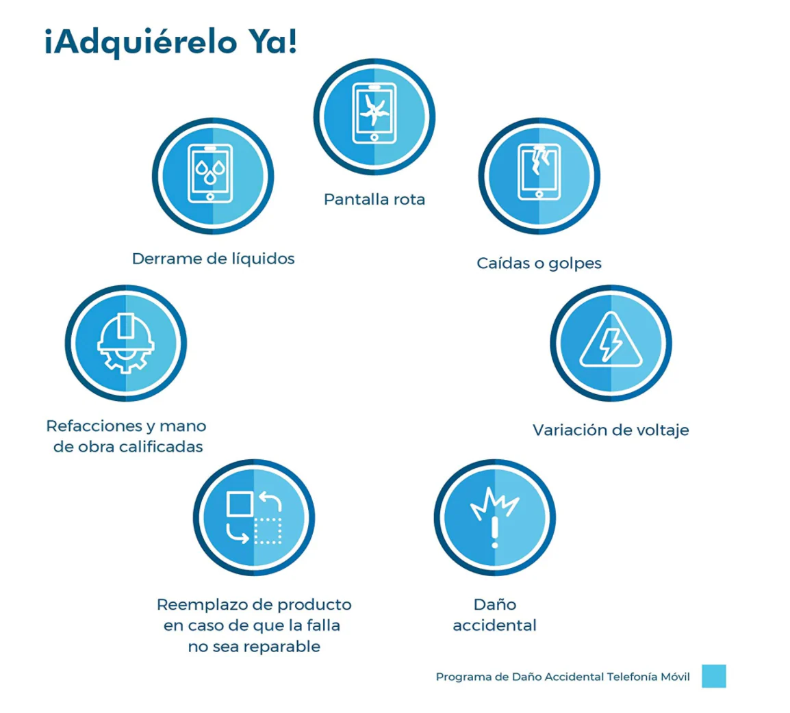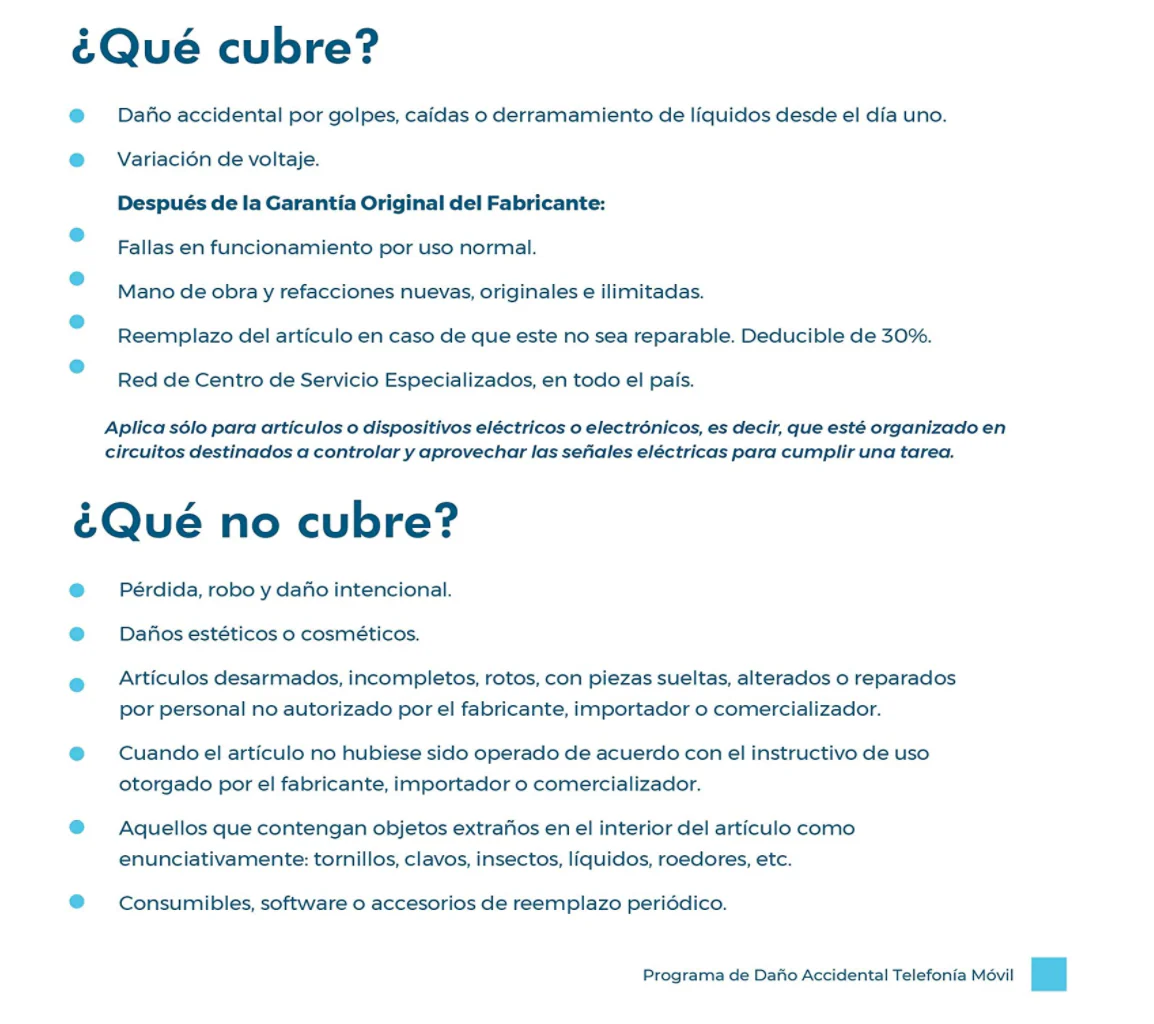 - Cobertura de Daño Accidental incluidos golpes, caÃdas o derramamiento de lÃquidos desde el dÃa uno, asà como cobertura de variación de voltaje.