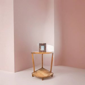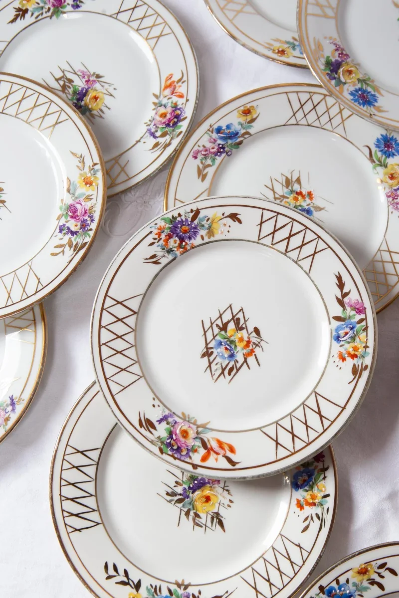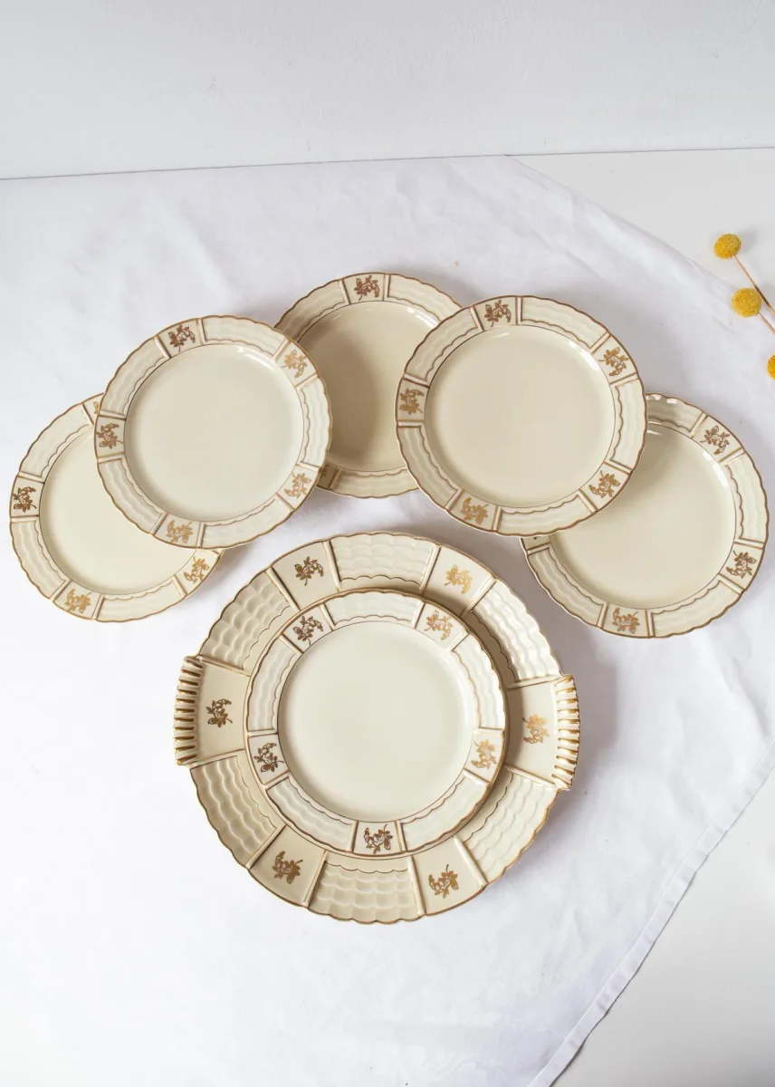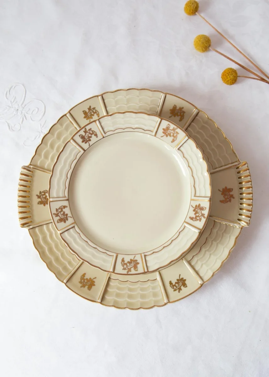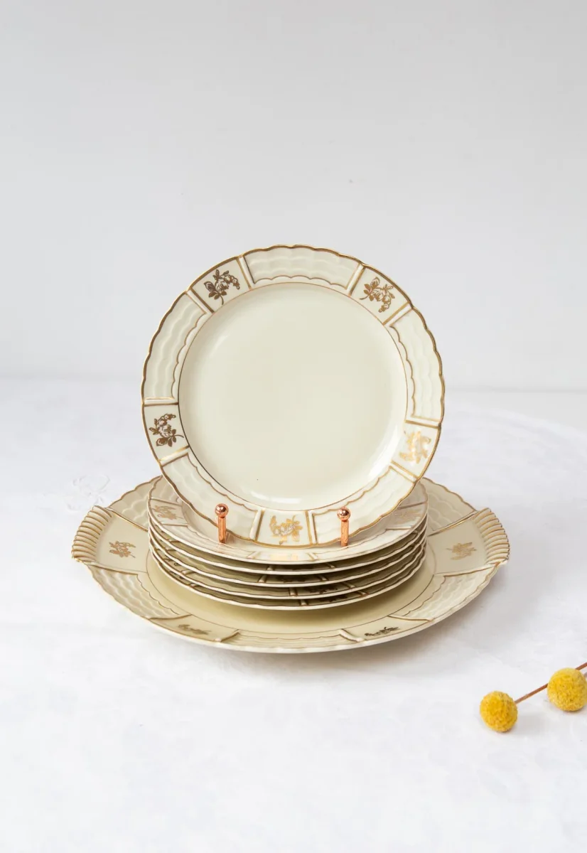 Juego de postre en porcelana de Limoges, realizado por A. Lanternier & Cie hacia 1920–1935. Conjunto formado por una fuente y 6 platos, decorados en relieve con fileteado dorado y motivos heráldicos sobre fondo marfil. Una de las manufacturas más prestigiosas de Limoges, célebre por la calidad de su porcelana y sus decoraciones refinadas.