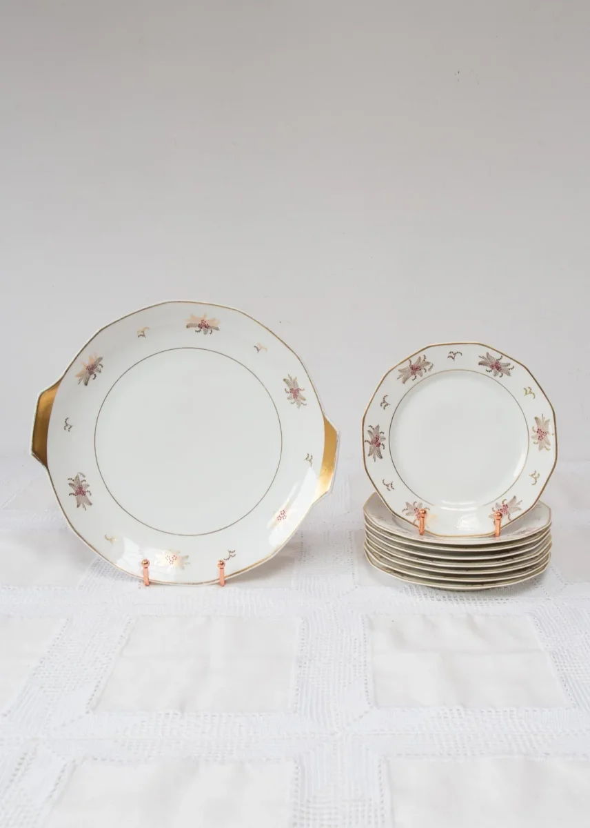 Dessert set in Limoges porcelain by A. Lanternier & Cie, dating from around 1920–1935. Comprising one serving plate and 6 dessert plates, decorated in relief with gilt accents and heraldic motifs on an ivory background. From one of Limoges’ most prestigious makers, renowned for its refined quality and elegant designs. In excellent condition, with very little use and no chips. Dimensions: ⌀ 18 cm (plates), 28*26,5 cm (dish). Shipping costs will be added at checkout.