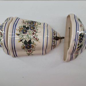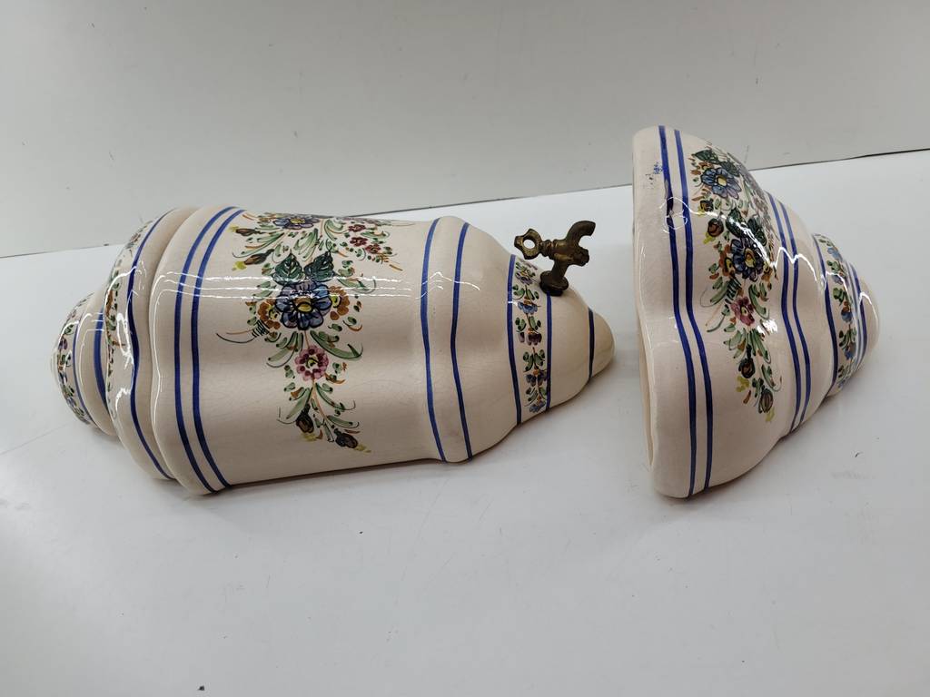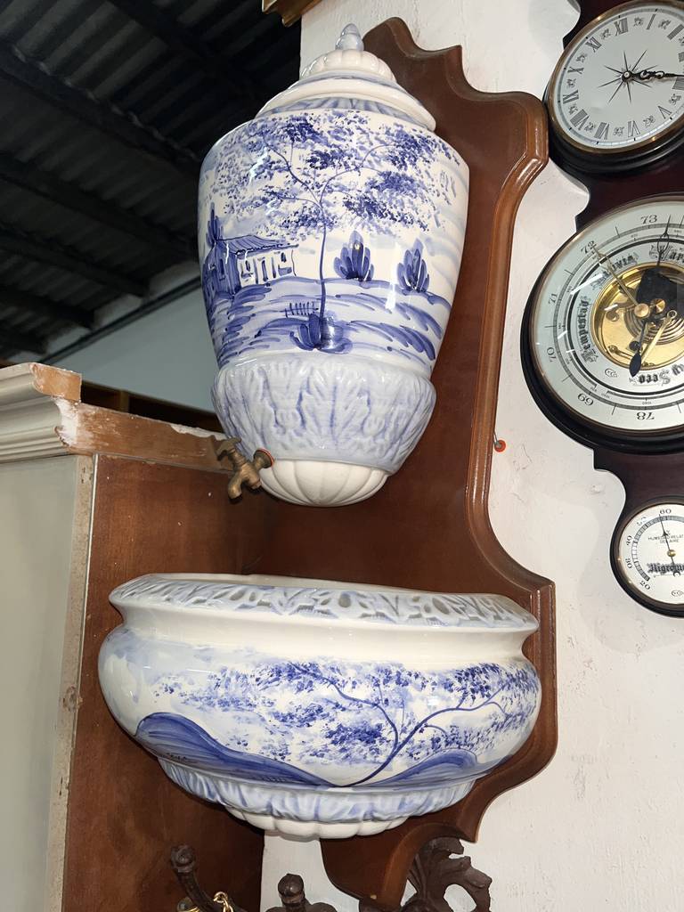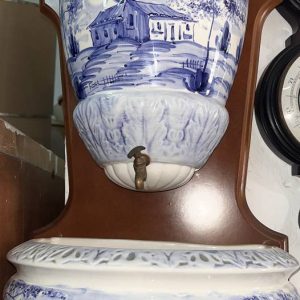 Aguamanil para pared. Se trata de un aguamanil muy bonito con una decoración floral pintada y con finas líneas en azul que le aporta un toque distintivo. Tiene la fuente separada con la misma decoración. Es ideal para colgar en un porche o jardín y aportar un toque único a nuestra estancia. Como podemos observar en las fotografías se encuentra en buenas condiciones.