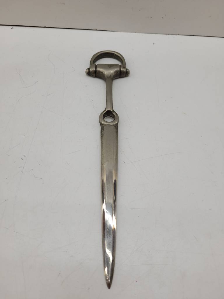 Abrecartas muy bonito y elegante con una base para colocarlo en forma vertical y hacerlo resaltar así como mango para cogerlo fácilmente. Es un abrecartas ideal para darle un toque elegante a nuestra oficina o despacho así como también para ser utilizado. Como podemos observar en las fotografías se encuentra en buenas condiciones.