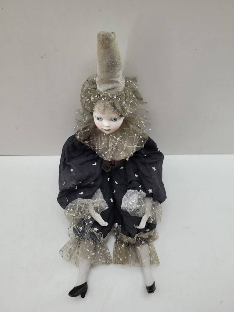 Muñeco de arlequín fabricado en porcelana de buena calidad vestido con un traje oscuro. Se trata de un muñeco de tamaño mediano de color blanco que va vestido con un traje de arlequín de color oscuro con un sombrero a juego. Es un muñeco ideal para ponerlo en un salón comedor de un hogar o en cualquier otra estancia a modo decorativo. Como se puede observar en las fotografías se encuentra en buenas condiciones.