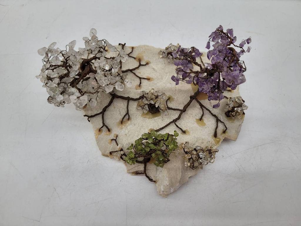 Conjunto formado por tres pequeños arbolitos fabricados en alambre que se encuentran encima de una piedra de color blanco. Se trata de un conjunto de tres árboles de color verde, morado y blanco que resultan ideales para colocarlos en un salón comedor a modo decorativo. Como se puede observar en las fotografías se encuentran en buenas condiciones.