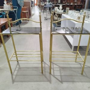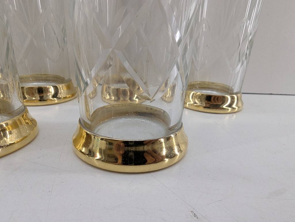 Conjunto formado por seis vasos de tubo transparentes con la base redonda y dorada. Se trata de seis vasos de talla E que tienen la superficie tallada con elegantes líneas. Son unos vasos perfectos para tenerlos tanto en una cocina como en un salón comedor de un hogar clásico y distinguido. Como se puede observar en las fotografías se encuentran en buenas condiciones.