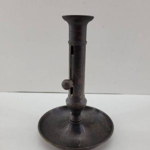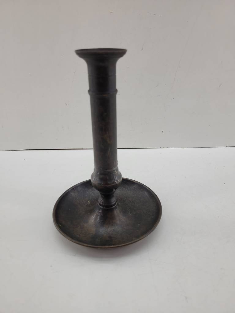 Antiguo porta velas fabricado en material de buena calidad de color negro. Se trata de un porta velas que tiene una base redonda y curva para recoger la cera que cae de la vela. Este porta velas se puede colocar en un salón comedor y poner dentro una vela para iluminar una estancia. Como se puede observar en las fotografías se encuentra en buenas condiciones.