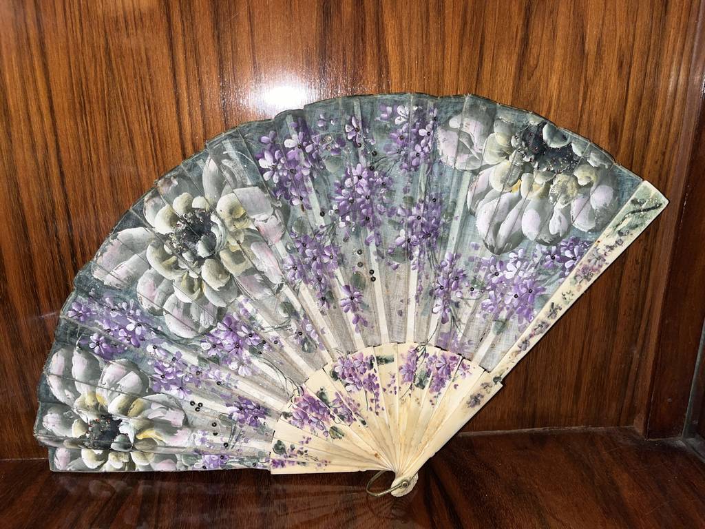 Abanico antiguo de hueso con un hermoso estampado de flores moradas y blancas. Se trata de un abanico de estilo clásico pintado a mano y fabricado con tela y hueso. Es un abanico muy especial que resulta perfecto para coleccionistas de este tipo de objetos, pero también puede servir como elemento decorativo por su belleza. Como se puede observar en las fotografías se encuentra en buenas condiciones.