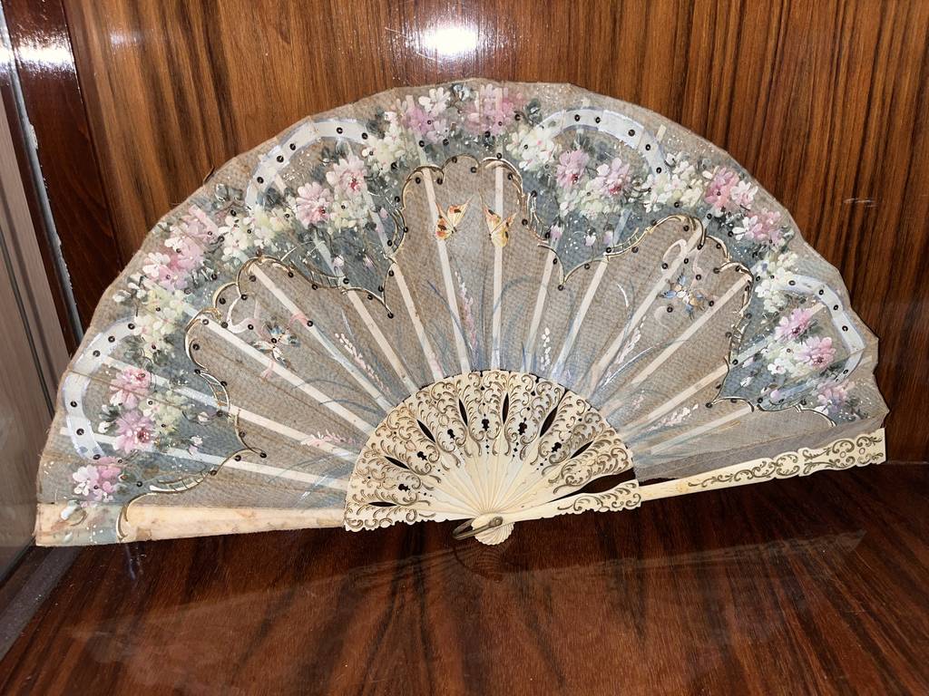 Abanico antiguo de hueso con un hermoso estampado de flores rosas y blancas. Se trata de un abanico de estilo clásico pintado a mano y fabricado con tela y hueso. Es un abanico muy especial que resulta perfecto para coleccionistas de este tipo de objetos, pero también puede servir como elemento decorativo por su belleza. Como se puede observar en las fotografías se encuentra en buenas condiciones.