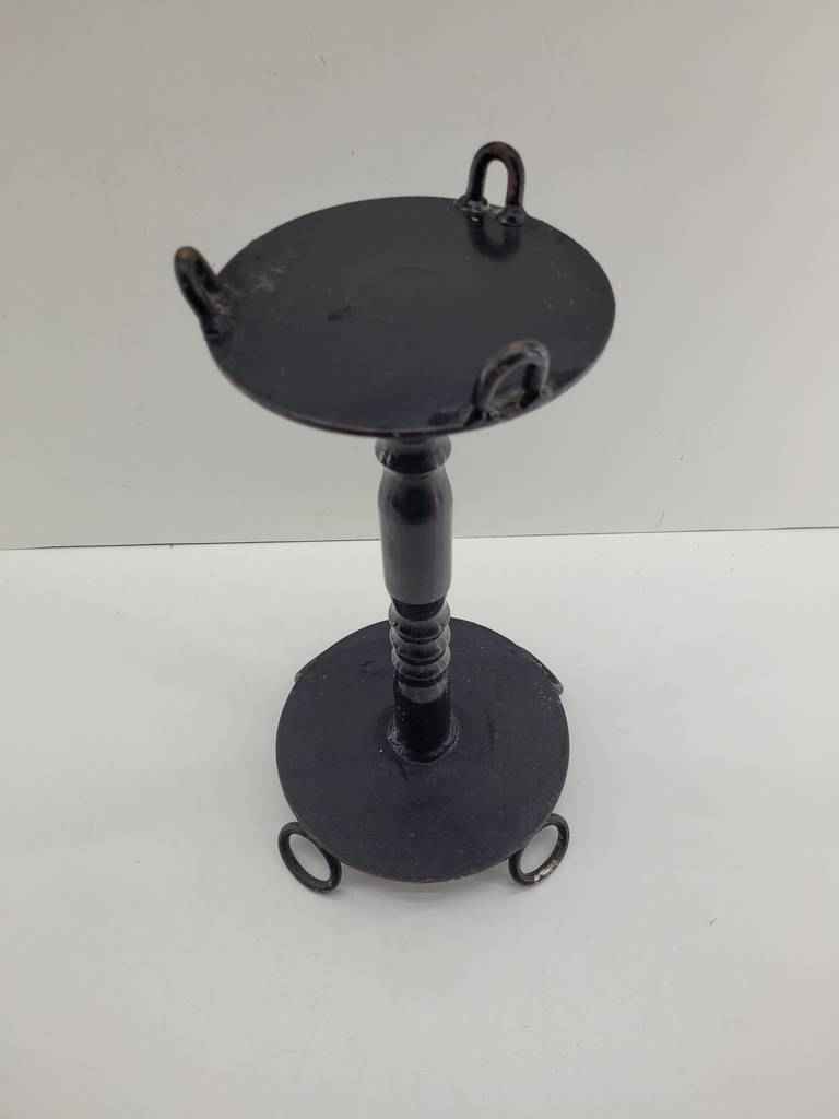 Candelabro fabricado en hierro forjado de color negro. Se trata de un candelabro con una base circular y una parte superior con la misma forma redondeada. Dispone de una altura media por lo que resulta ideal para colocarlo encima de una mesa en un salón comedor o en un vestidor. Como se puede observar en las fotografías se encuentra en buenas condiciones.
