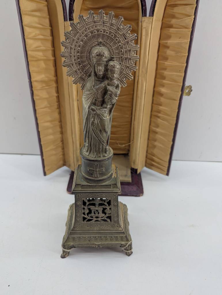 Capilla con la imagen de la Virgen del Pilar que tiene música incorporada. Se trata de una pequeña capilla de madera que tiene una base con una forma cuadrada y resistente que lleva la figura de la Virgen del Pilar. Es un objeto clásico y solemne que resulta ideal para coleccionistas de objetos religiosos. Como se puede observar en las fotografías se encuentra en buenas condiciones.