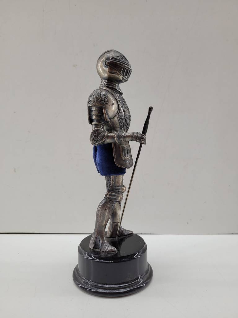 Caballero medieval fabricado en metal de buena calidad y resistente de color gris oscuro. Se trata de una figura de un caballero de la época medieval que tiene un tamaño pequeño y se encuentra plantado encima de una peana circular de color negro. Es una figura que puede servir como decoración en un salón comedor o para coleccionistas de este tipo de piezas. Como se ve en las imágenes está en buen estado.
