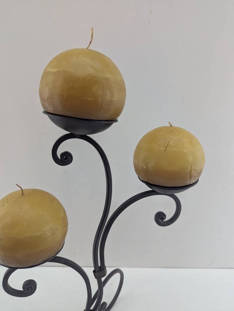 Candelabro fabricado en hierro forjado de color negro que tiene tres velas con una forma esférica. Se trata de un candelabro de estilo rústico que tiene una original forma y cuenta con tres velas esféricas colocadas a distintas alturas. Es un candelabro ideal para adornar una mesa o una cómoda en un salón comedor. Como se puede observar en las fotografías se encuentra en buenas condiciones.