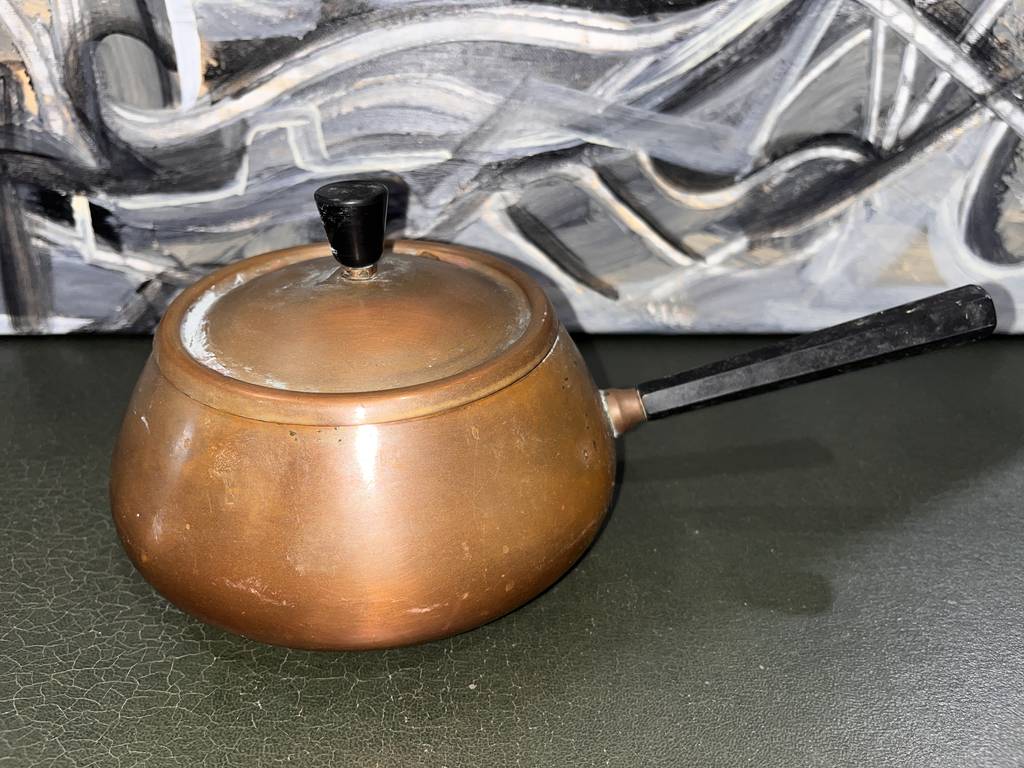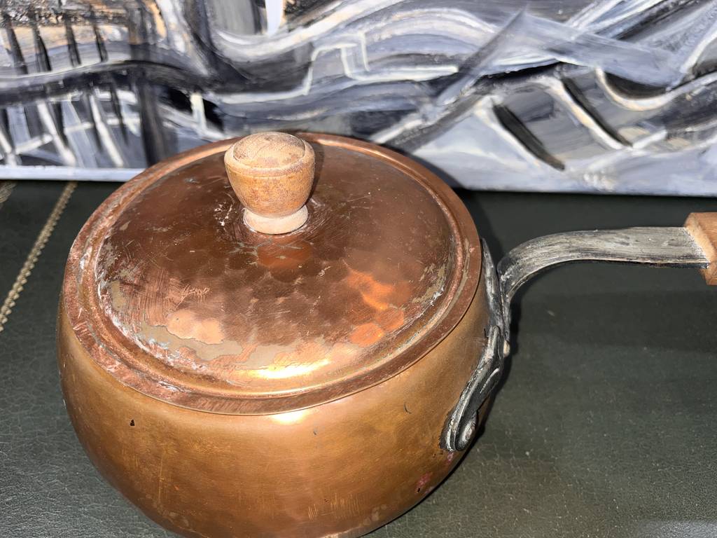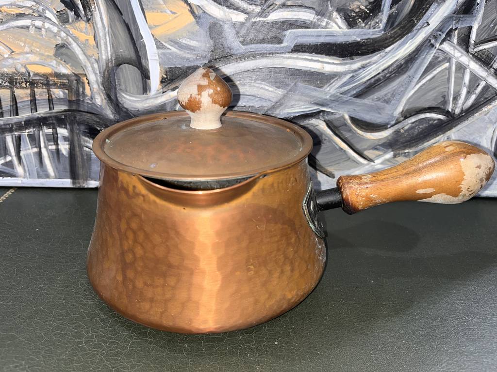 Cazo fabricado en cobre de buena calidad de tamaño pequeño. Se trata de un cazo de cobre que cuenta con un mango largo para poder cogerlo y manipularlo con mayor facilidad y tiene una pequeña tapa. Es un cazo ideal para tenerlo en la cocina del hogar para hervir agua o cocinar cualquier cosa en el día a día. Como se puede observar en las fotografías se encuentra algo desgastado por el uso.