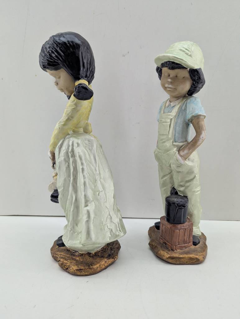 Pareja formada por dos figuras de porcelana de un niño y una niña de color. Se trata de dos figuras fabricadas en porcelana de buena calidad que representan a un niño y a una niña de color que van vestidos con ropa típica de una época pasada. Son dos figuras ideales para colocarlas encima de una estantería en un salón comedor. Como se puede observar en las fotografías se encuentran en buenas condiciones.