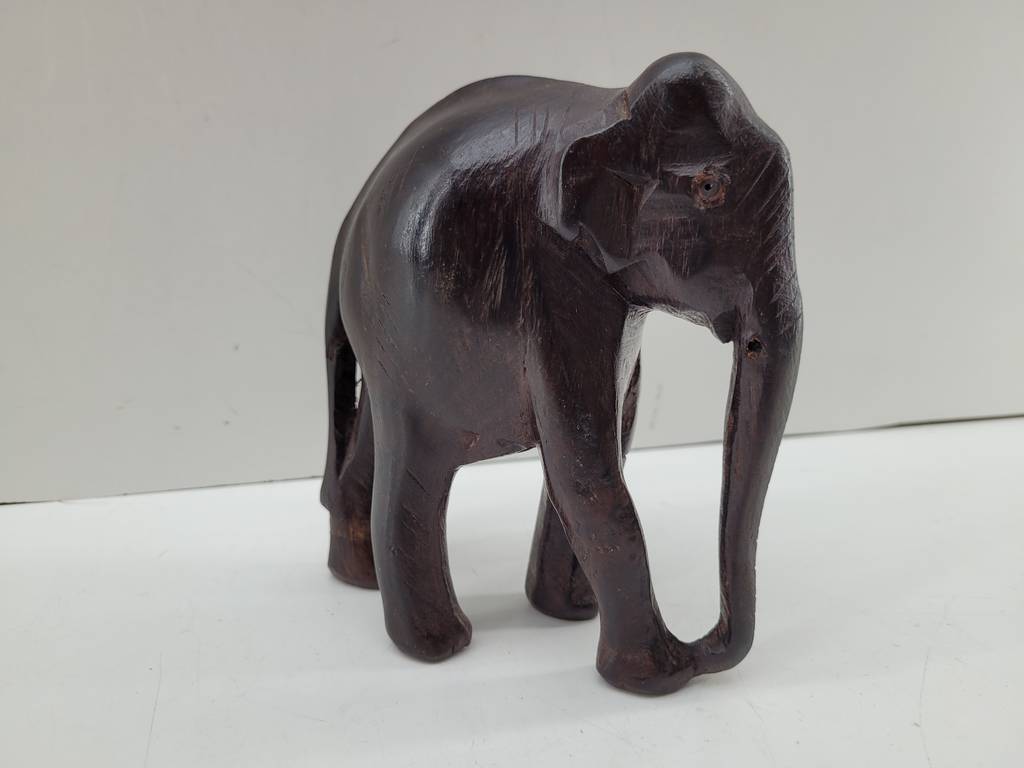 Figura de elefante que ha sido realizada con madera de buena calidad y robusta. Se trata de una figura tallada con gran precisión y detalle. También ha sido pintada en un marrón oscuro que le aporta elegancia. Es una figura ideal para decorar cualquier estancia de nuestra casa, en especial un recibidor o un salón comedor. Como podemos observar en las fotografías presenta ligeros desperfectos.