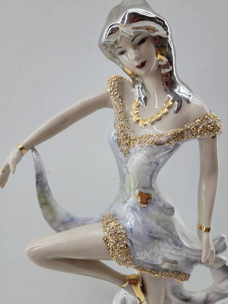 Escultura decorativa que ha sido realizada con porcelana de buena calidad. Se trata de una figura en la que podemos observar a una mujer con un vestido de noche y con sus mejores galas sobre una pierna. Es una figura ideal para decorar un recibidor o un salón comedor aportándole un toque elegante. Como podemos observar en las fotografías se encuentra en buenas condiciones.