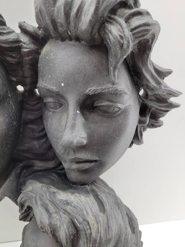 Figura de caras fabricada en metal de buena calidad y resistente de color negro. Se trata de una figura de tamaño mediano que está formada por cuatro caras, dos de hombre y dos de mujer, y lleva una inscripción en la que se puede leer Europa line. Es una figura ideal para colocarla en un salón comedor como elemento decorativo. Como se puede observar en las fotografías se encuentra en buenas condiciones.