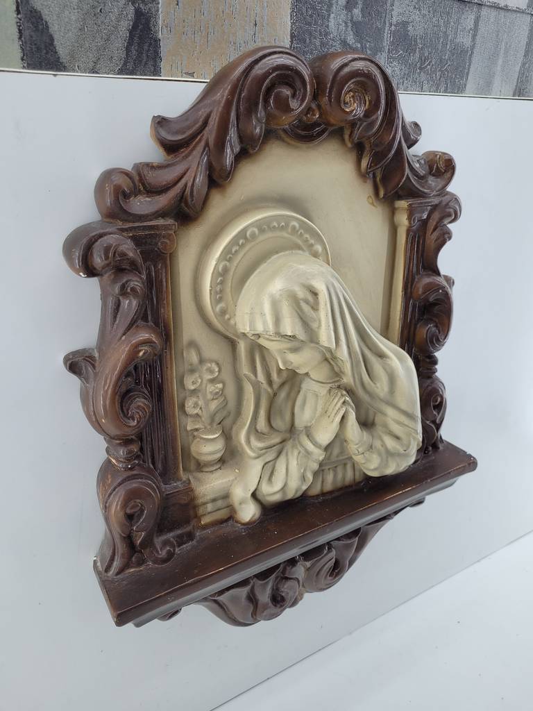 Figura de ave María fabricada en madera de buena calidad de color marrón oscuro y gris. Se trata de una figura de tamaño mediano en la que aparece una virgen con las manos en posición de rezar y tiene un manto en la cabeza. Es una figura perfecta para colocarla en la pared de un salón comedor. Como se puede observar en las fotografías se encuentra en buenas condiciones