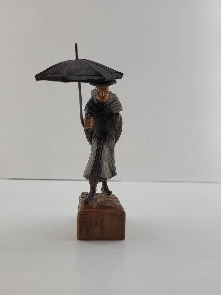 Figura de tamaño pequeño en la que se lee la inscripción chove en Santiago. Se trata de una pequeña figura que representa a un señor con gabardina y sombrero que va caminando con un paraguas en un día de lluvia y viento. Es una figura muy realista que resulta ideal como elemento decorativo. Como se puede observar en las fotografías se encuentra en buenas condiciones.