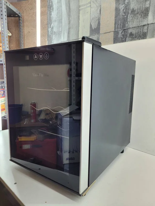 Vinoteca eléctrica de la marca Vin sur Vin de color negro. Se trata de una práctica vinoteca de tamaño mediano que resulta ideal para tenerla en la cocina del hogar o en el salón comedor para guardar en buen estado las botellas de vino. Como se puede observar en las fotografías la vinoteca tiene un ligero desperfecto en la parte superior que no afecta a su funcionalidad.
