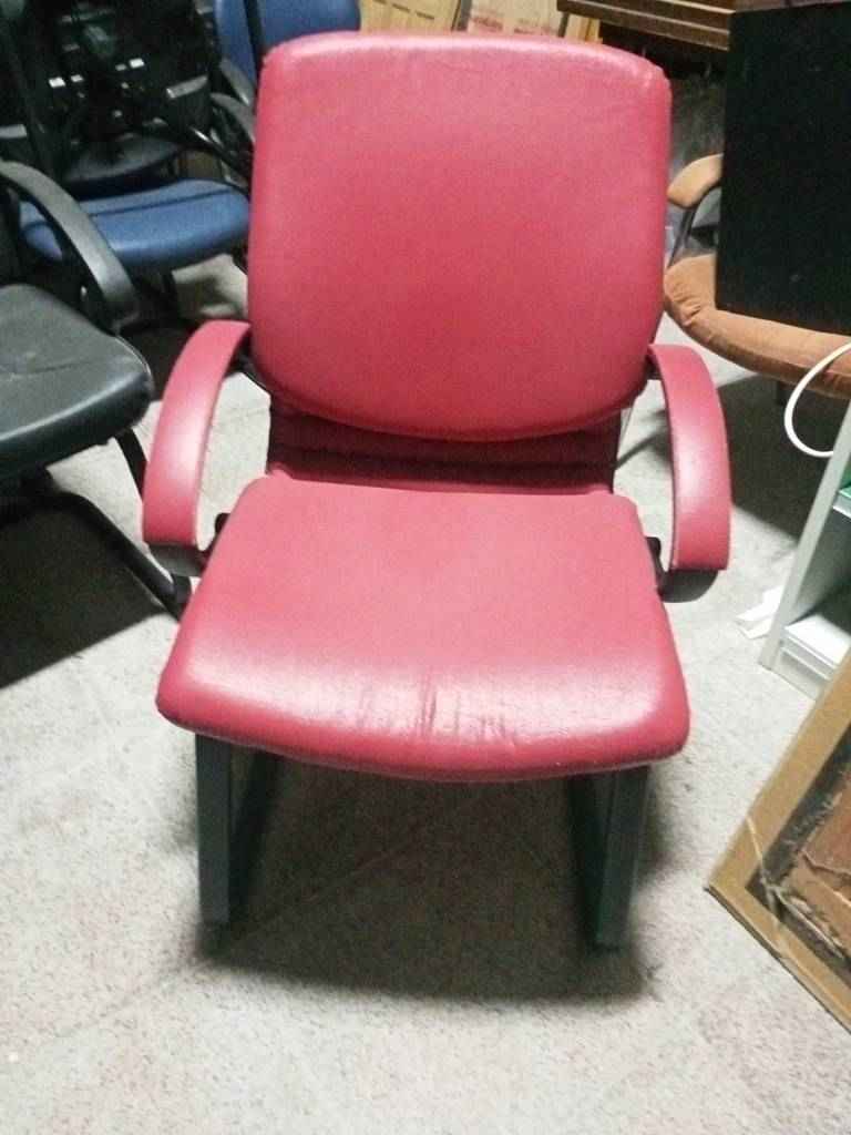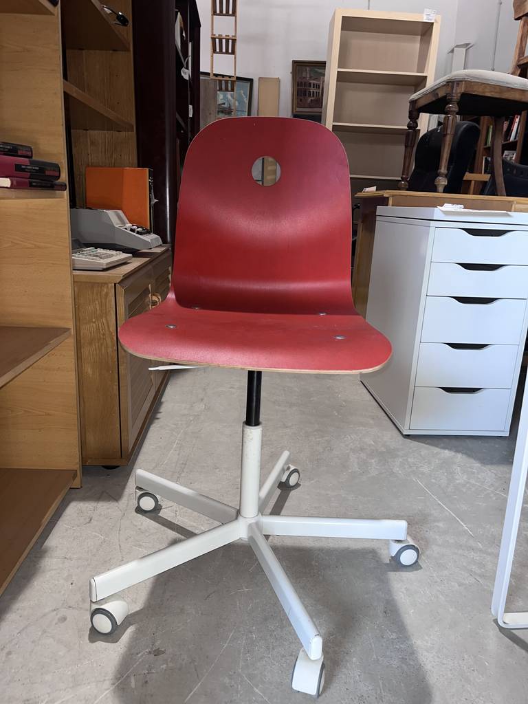 Silla de oficina fabricada en polipiel de color rojo con ruedas y reposabrazos. Se trata de una cómoda silla que cuenta con un cómodo asiento, un resistente respaldo y dos prácticos reposabrazos. Es una silla ideal para tenerla en casa y colocarla en un estudio, pero también se puede utilizar en un negocio en el que los clientes puedan esperar sentados cómodamente. Como se puede observar en las fotografías se encuentra en buenas condiciones.