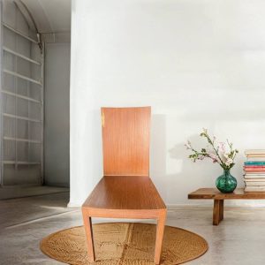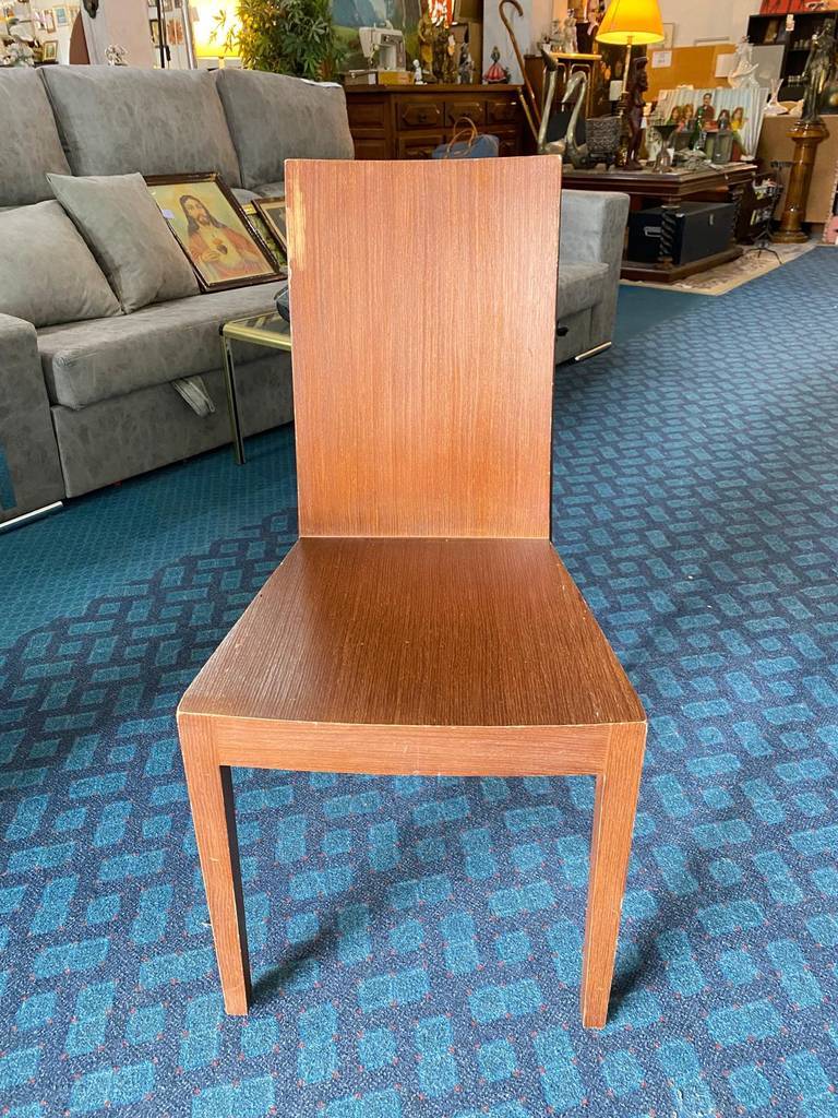 Silla de estilo moderno que ha sido fabricada con madera de buena calidad y robusta. Se trata de una silla con un diseño muy original. Es una silla muy versátil puesto que puede servir para colocar en un salón comedor pequeño así como para una sala de espera o para una oficina. Como podemos observar en las fotografías presenta un desperfecto en el respaldo.