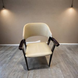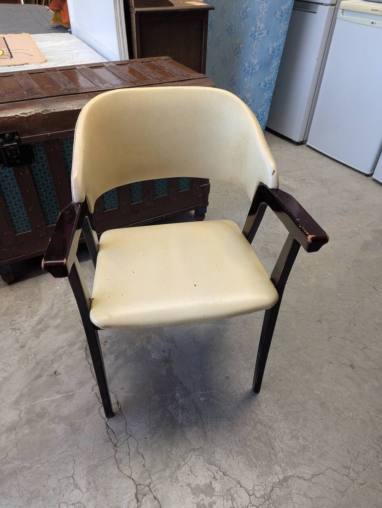 Silla de madera de estilo vintage con una estructura de madera de buena calidad y robusta. Esta ecléctica silla tiene un asiento y respaldo mullidos y cómodos que han sido tapizados en polipiel. También tiene dos reposabrazos de madera en los laterales para un mayor confort. Es ideal para colocar en un despacho o oficina. Como podemos observar en las fotografías presenta desperfectos.