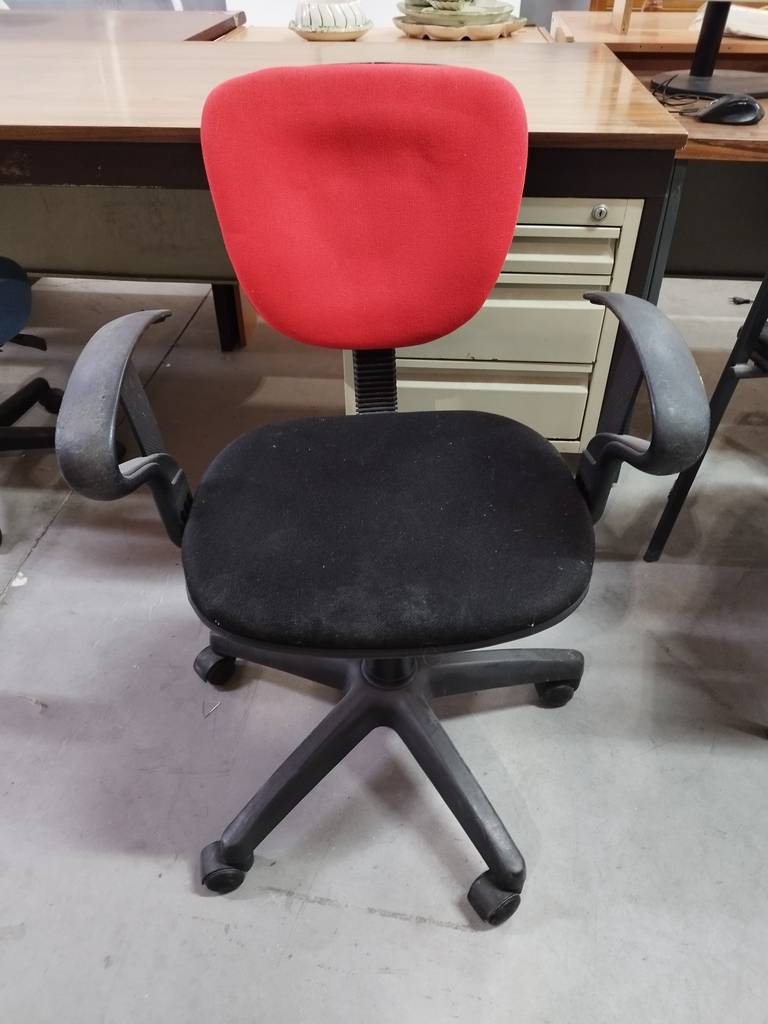 Silla de escritorio de color negro y rojo. Se trata de una silla de escritorio que cuenta con dos reposabrazos de plástico duro, tiene un asiento y un respaldo acolchados y dispone de cinco patas con ruedas para poder moverla por la estancia con mayor facilidad. Es una silla ideal para ponerla en un escritorio dentro de un estudio. Como se puede observar en las fotografías se encuentra en buenas condiciones.