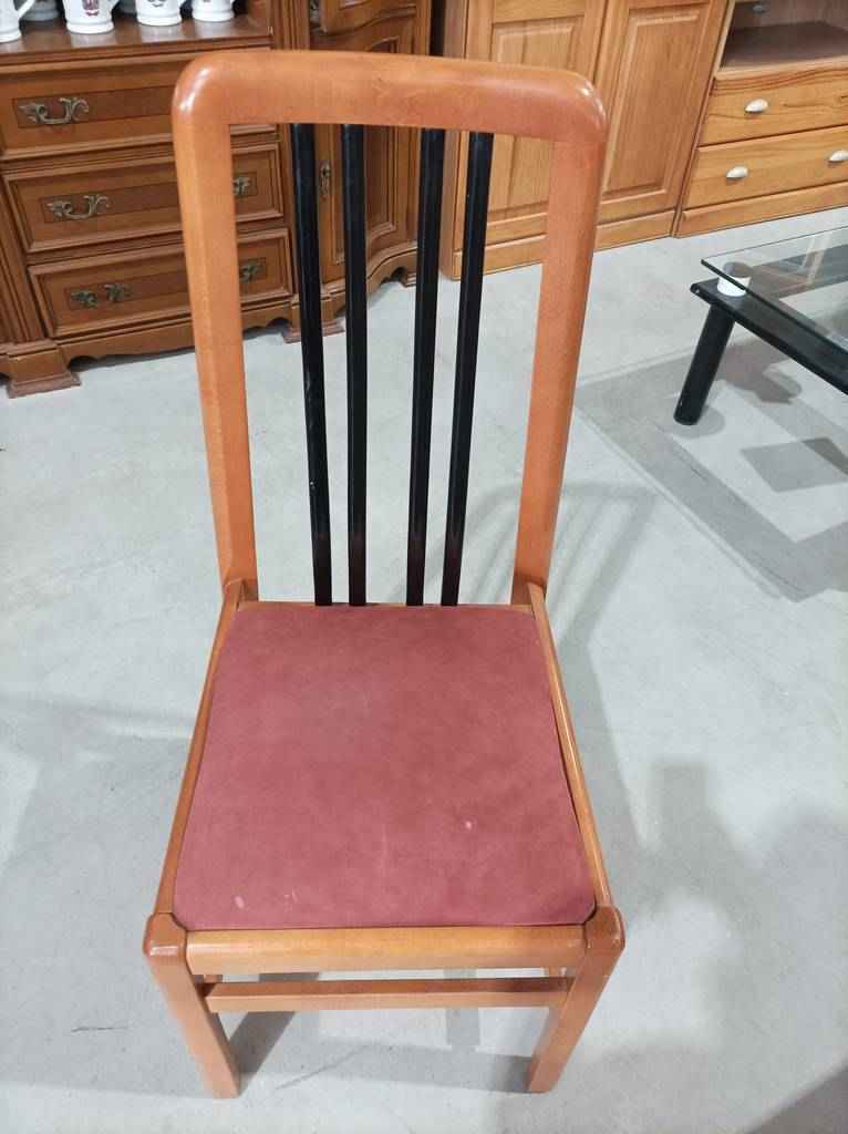 Silla de madera clásica, ideal para salón comedor. Tiene la estructura principal hecha de madera de buena calidad y robusta color marrón. La parte del asiento es acolchada, de tela suave y agradable al tacto color granate. El respaldo tiene un diseño muy original, con cuatro barras negras que la hacen resaltar. Las patas están unidas entre ellas para hacerla más estable. Se encuentra bien cuidada como se puede ver en las imágenes.