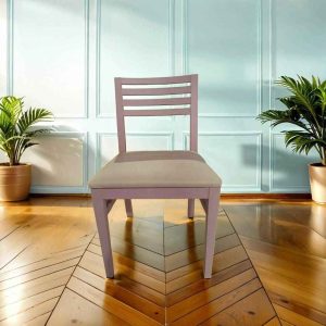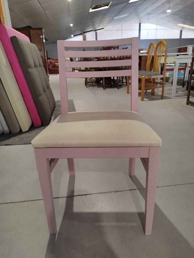 Silla de madera de color rosado que ha sido realizada con madera de buena caldiad y robusta. Se compone de un respaldo con cuatro listones de madera unidos que la hacen resaltar. Además su asiento es muy acolchado y cómodo con un color beige. Es ideal para colocar en un dormitorio o salón comedor. Como podemos observar en las fotografías se encuentra nueva a estrenar.