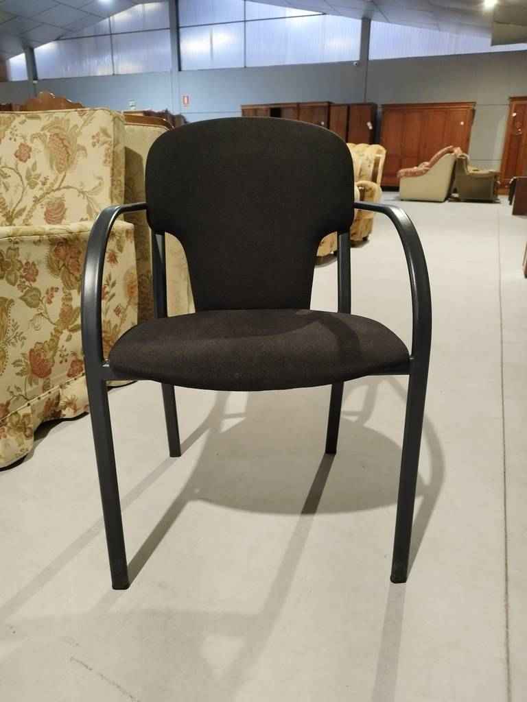 Silla confidente elegante y original con una estructura de metal en color negro con reposabrazos incluidos. También dispone de un asiento y respaldo muy cómodo y acolchado. Es una silla ideal para, por ejemplo, una sala de espera o también para colocar en un despacho cuando recibamos clientes. Como podemos observar en las fotografías presenta un ligero desgaste.