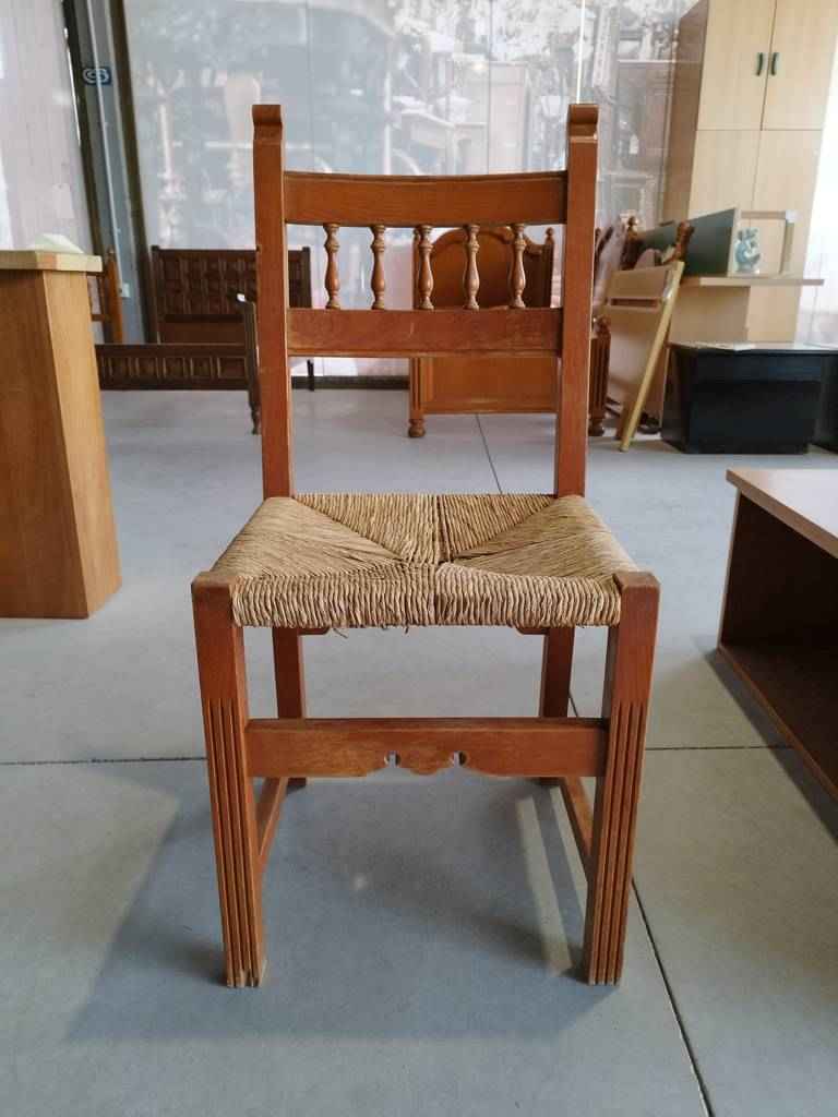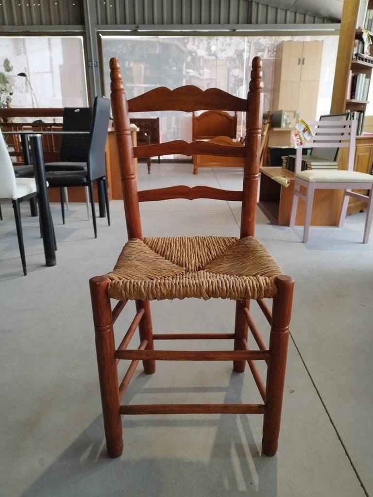 Silla de estilo rústico que ha sido fabricada con madera de buena calidad y robusta. Se trata de una silla muy versátil ideal tanto para una cocina como para un salón comedor. Sus cuatro patas están unidas por listones de madera lo que la hace una silla muy estable. Como podemos observar en las fotografías presenta ligeros rasguños pero cumple su función perfectamente.