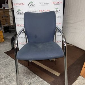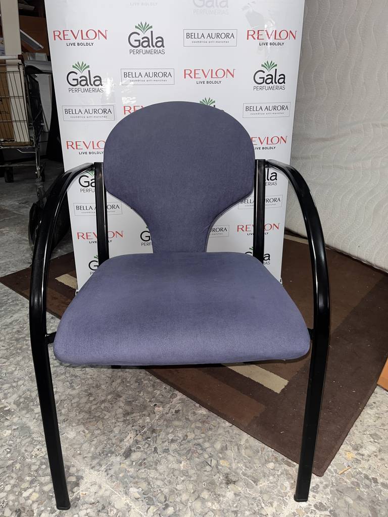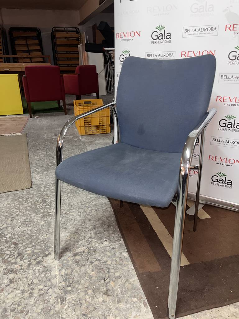 Silla de oficina que dispone de una estructura de metal de buena calidad. Su respaldo es de madera de buena calidad y robusta. Su asiento es de color azul y con un tapizado de tela suave y agradable al tacto. Es ideal para colocar en una oficina o en salas de espera. Como podemos observar en las fotografías presentan un pequeño desgaste pero en general se encuentran en buenas condiciones.