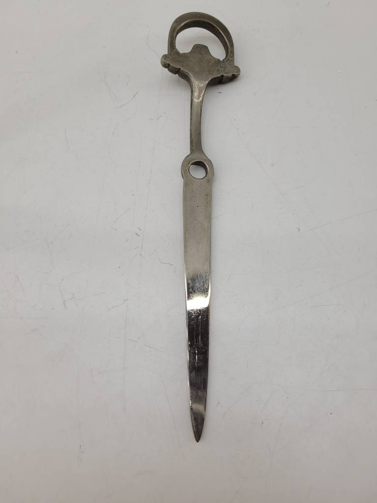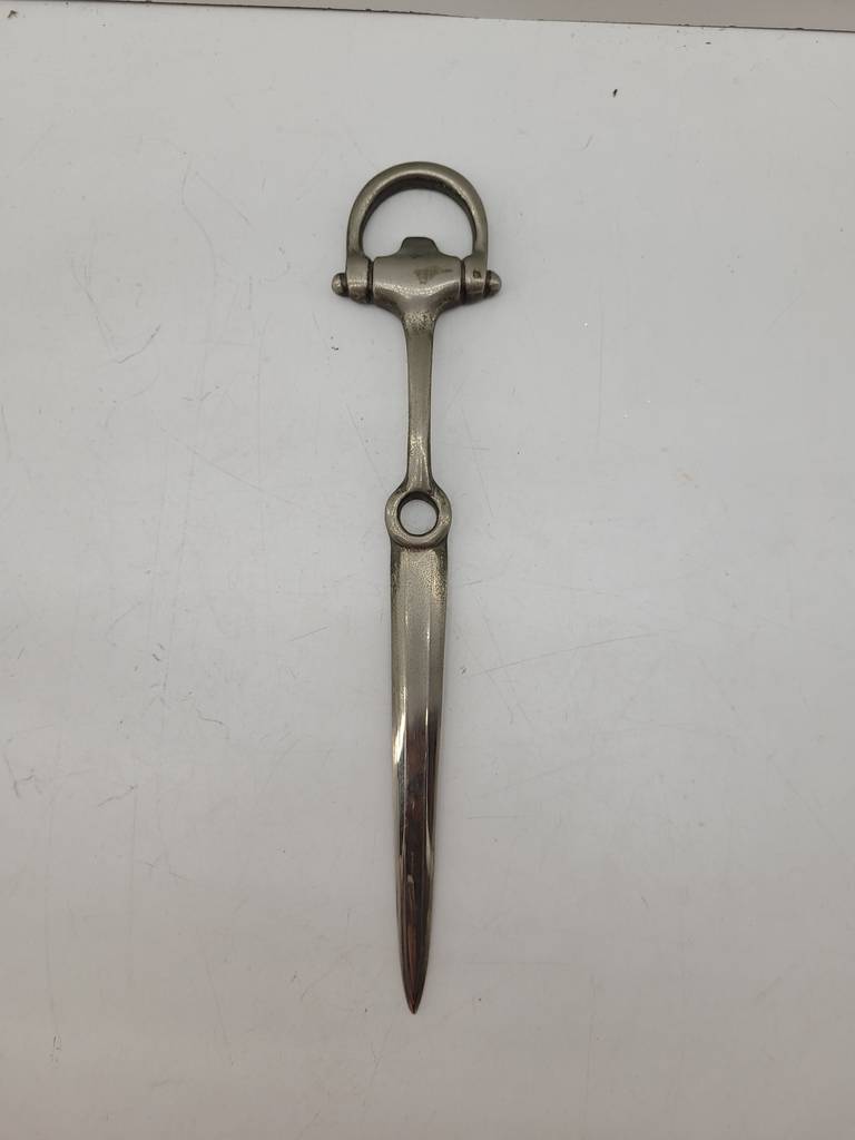 Abrecartas muy bonito y elegante con una base para colocarlo en forma vertical y hacerlo resaltar así como mango para cogerlo fácilmente. Es un abrecartas ideal para darle un toque elegante a nuestra oficina o despacho así como también para ser utilizado. Como podemos observar en las fotografías se encuentra en buenas condiciones.