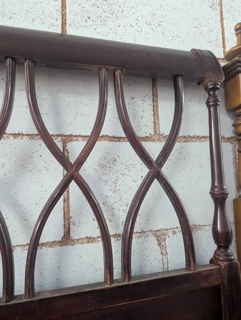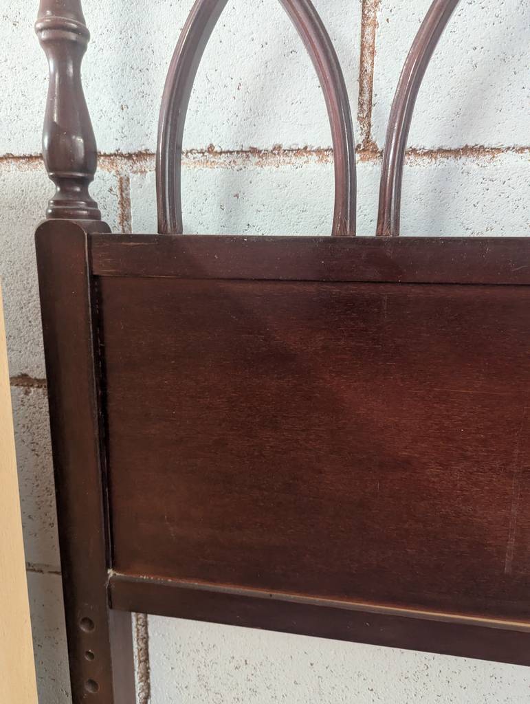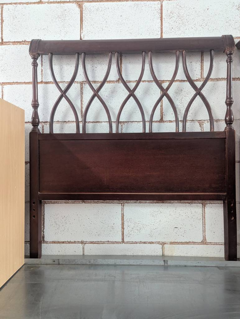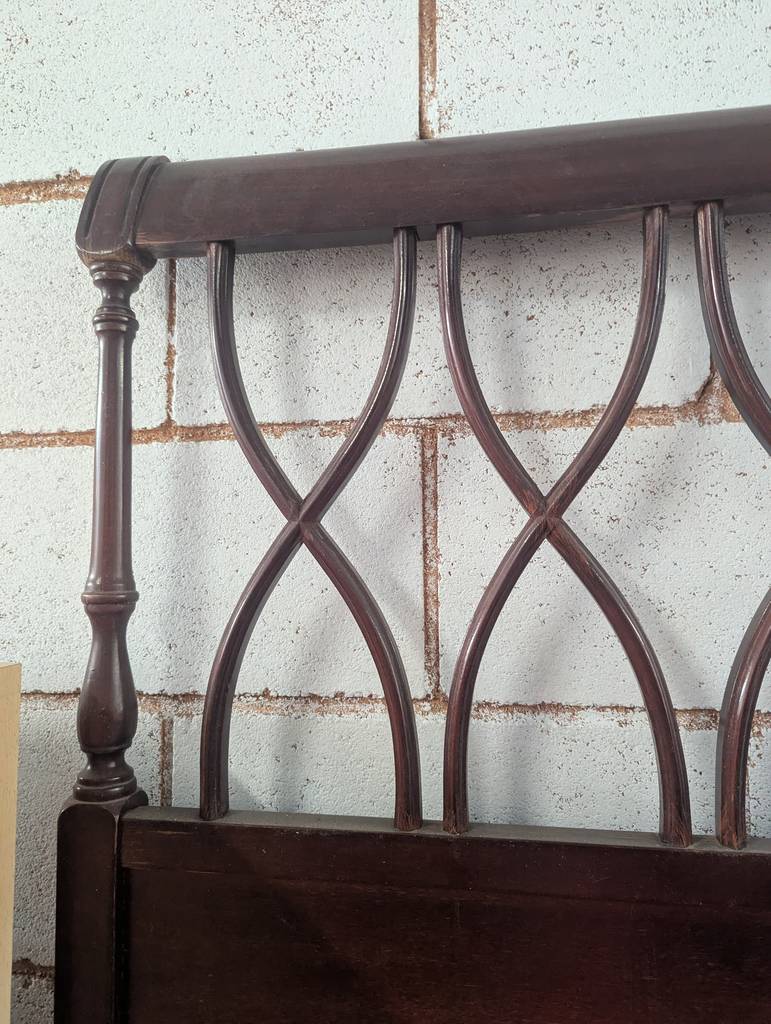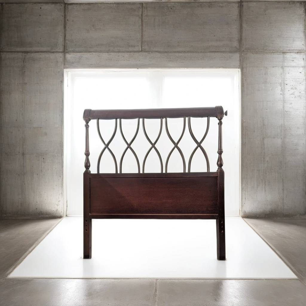 Cabecero de cama fabricado en madera de caoba de buena calidad de color oscuro. Se trata de un cabecero de cama de estilo clásico que resulta ideal para colocarlo en la cabeza de una cama de noventa centímetros de ancho en un dormitorio individual de estilo clásico o retro. Como se puede observar en las fotografías se encuentra en buenas condiciones para ser utilizado.