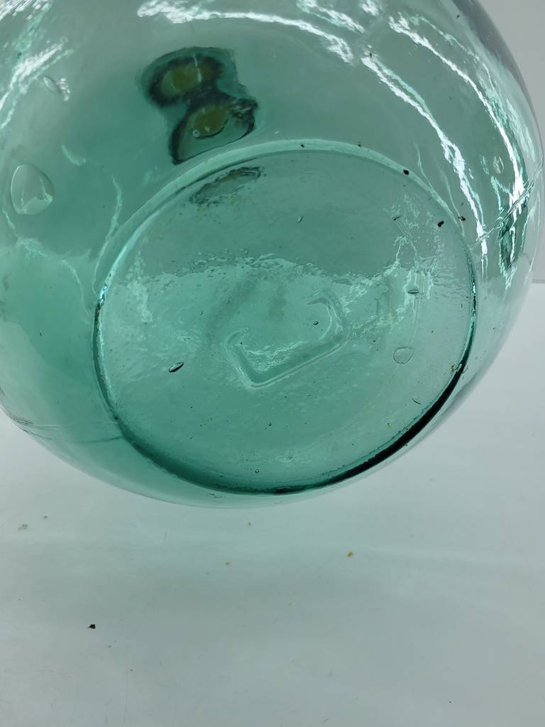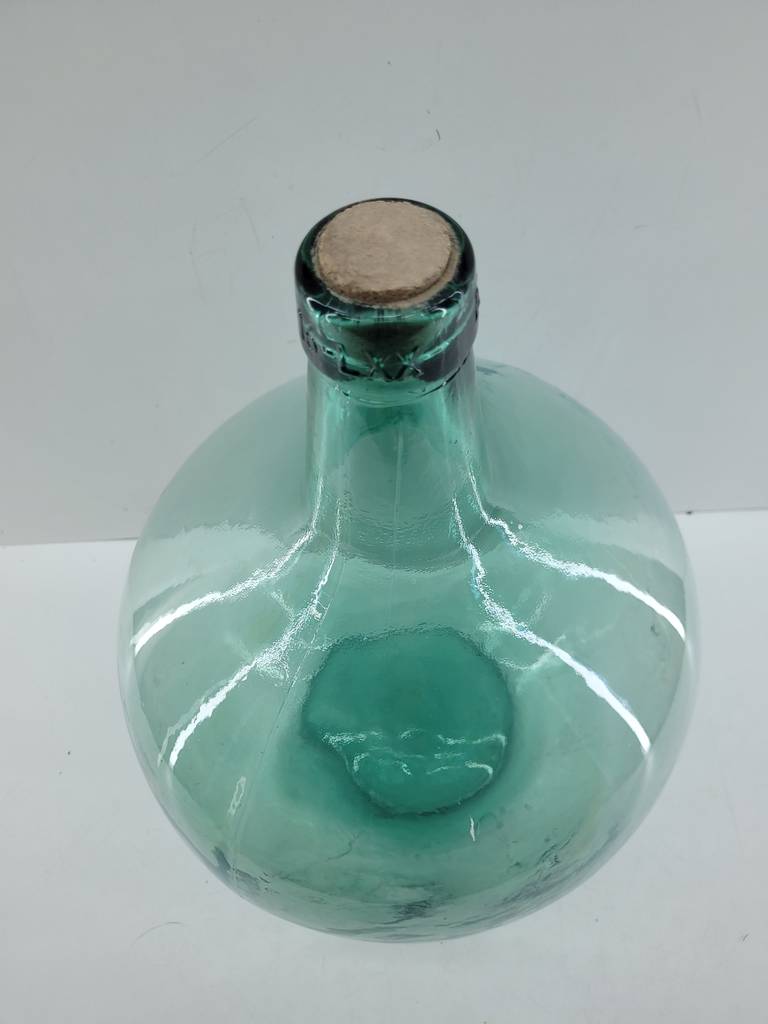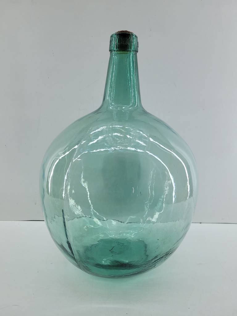 Damajuana fabricada en cristal grueso y resistente de color verde oliva. Se trata de una botella de grandes dimensiones a la que se la conoce con el nombre de damajuana. Es una botella que tiene una capacidad de ocho litros de almacenaje y cuenta con una base amplia y redonda y un cuello estrecho. Como se puede observar en las fotografías se encuentra en buenas condiciones.