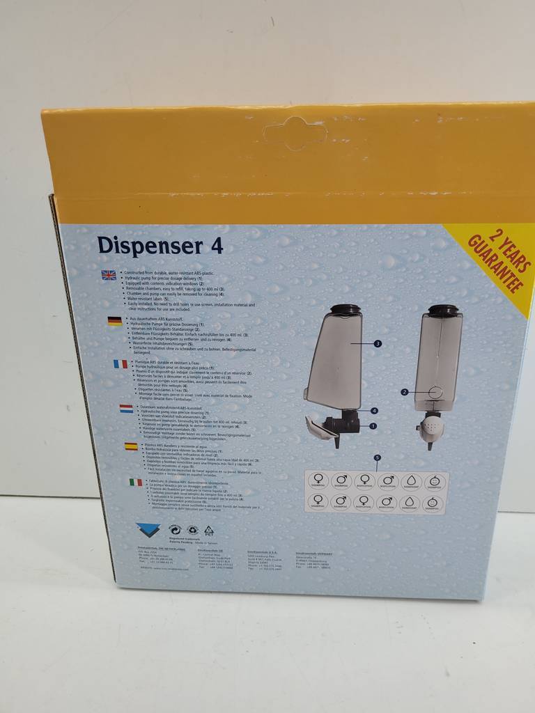 Dispensador de jabón compuesto por cuatro dispensadores para aseo o cocina. Es un dispensador múltiple ideal para ser colgado en pared y sin necesidad de realizar agujeros en pared. Viene con su caja y todo lo necesario para ser utilizado. Como podemos observar en las fotografías se encuentra en buenas condiciones. Aprovecha esta oportunidad de conseguir un dispensador de calidad a un precio muy económico.