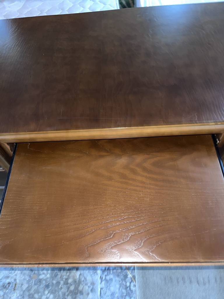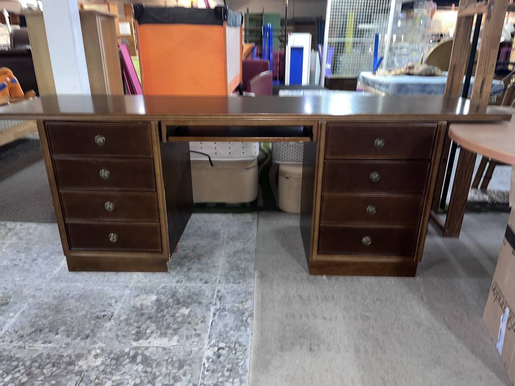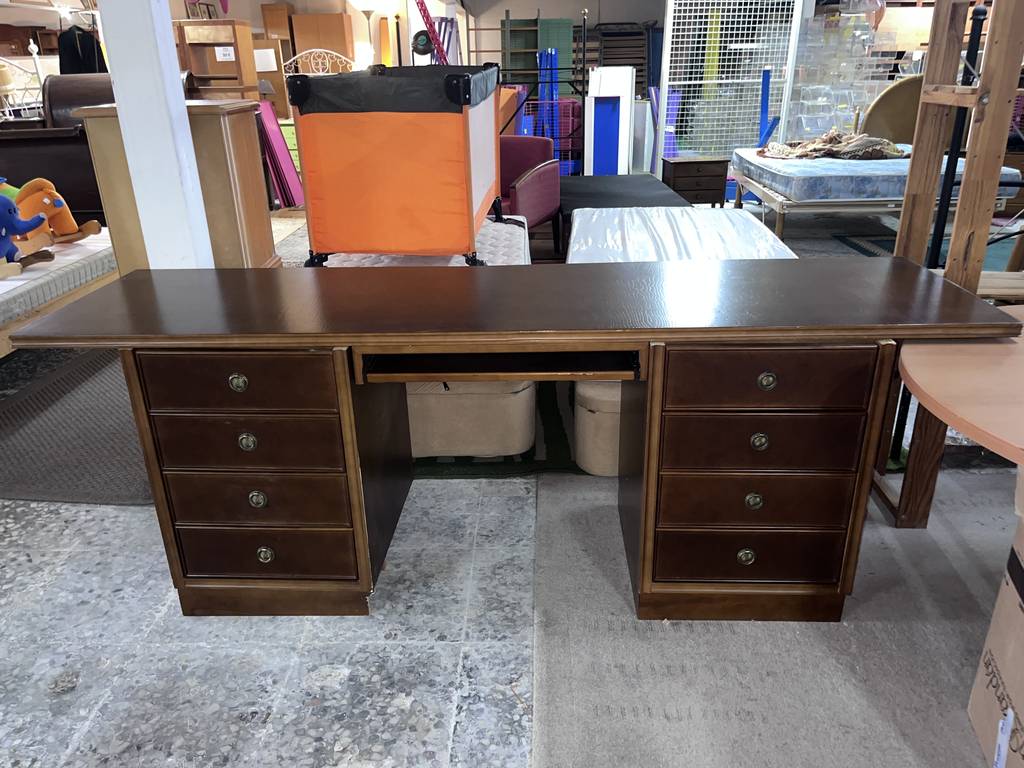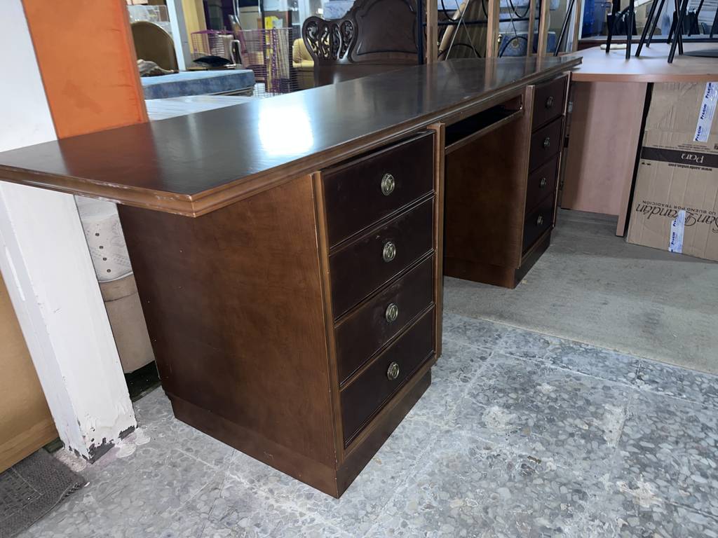 Escritorio de estilo vintage que ha sido fabricado con madera de buena calidad y robusta. Se trata de un escritorio de color marrón oscuro formado por una parte superior con un gran tablón y en la parte frontal cuatro cajones en cada lateral y en el centro una bandeja extraíble. Es ideal para colocar en una oficina y despacho. Como podemos observar en las fotografías se encuentra en buenas condiciones.