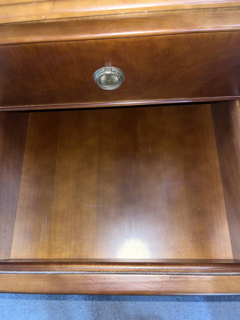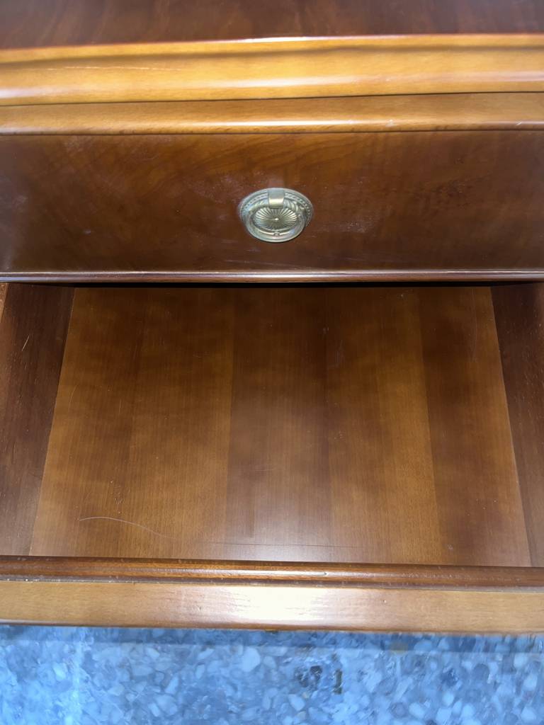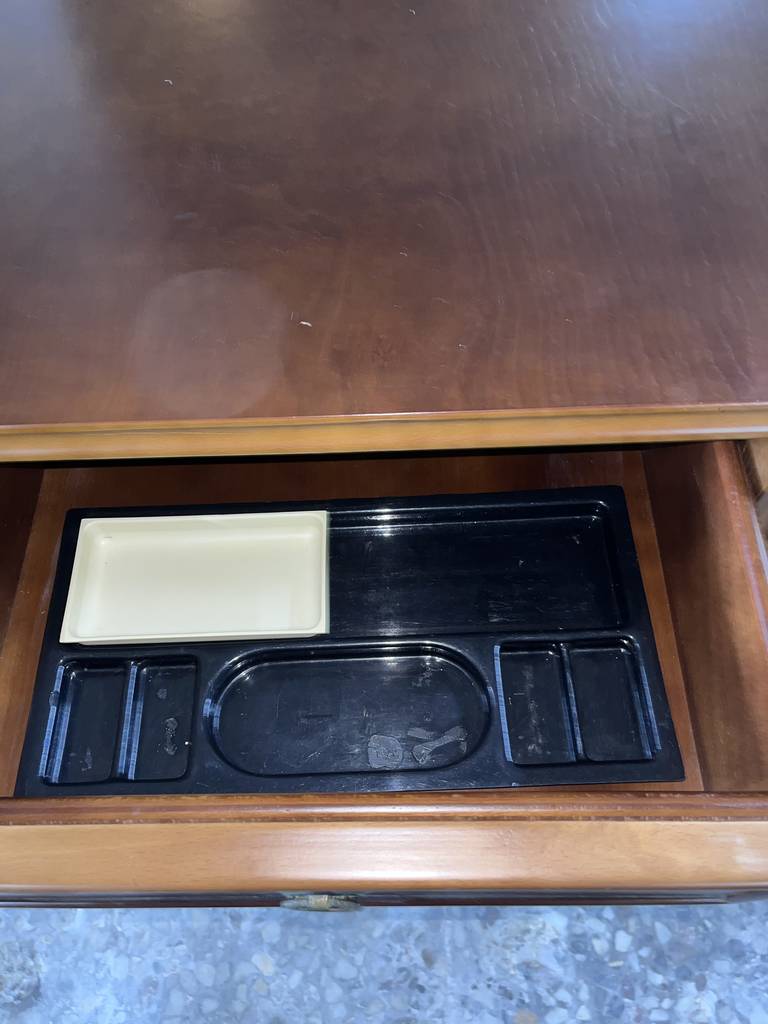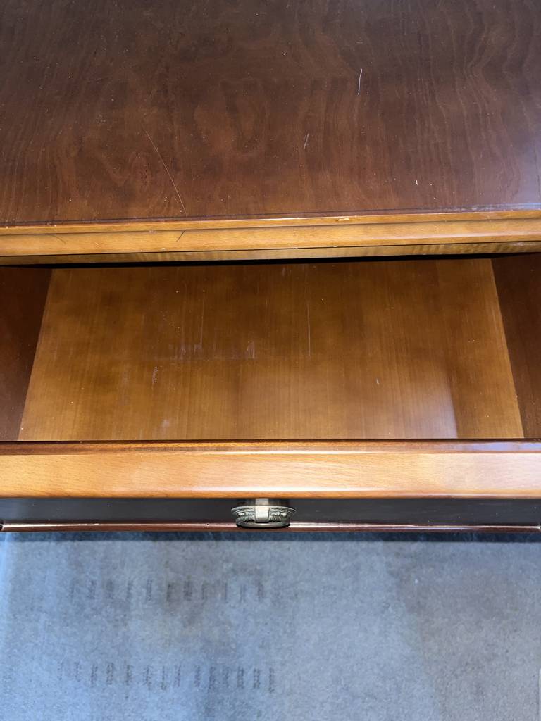 Escritorio de estilo vintage que ha sido fabricado con madera de buena calidad y robusta. Se trata de un escritorio de color marrón oscuro formado por una parte superior con un gran tablón y en la parte frontal cuatro cajones en cada lateral y en el centro una bandeja extraíble. Es ideal para colocar en una oficina y despacho. Como podemos observar en las fotografías se encuentra en buenas condiciones.