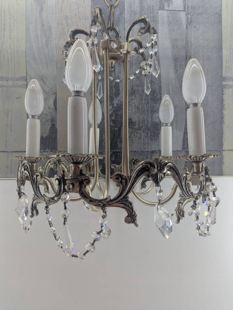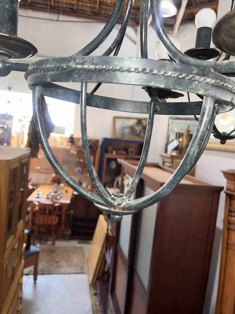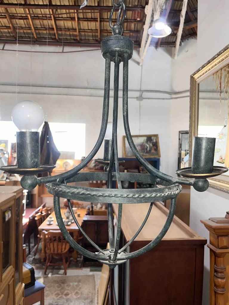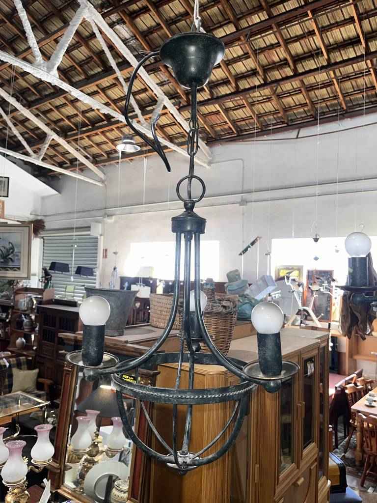 Lámpara de estilo vintage que ha sido realizada con forja de buena calidad. En color negro esta lámpara resaltara en cualquier estancia de nuestra casa, en especial en nuestro salón comedor. Dispone de tres puntos de luz en cada lado y de una parte inferior moldeada con gran precisión y cuidado. Como podemos observar en las fotografías presenta desgaste.