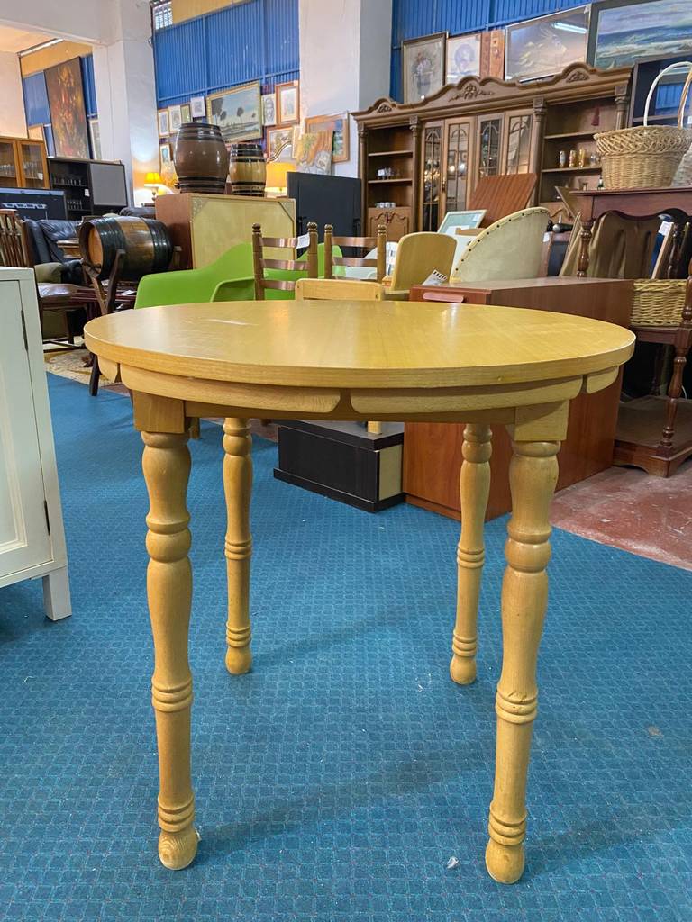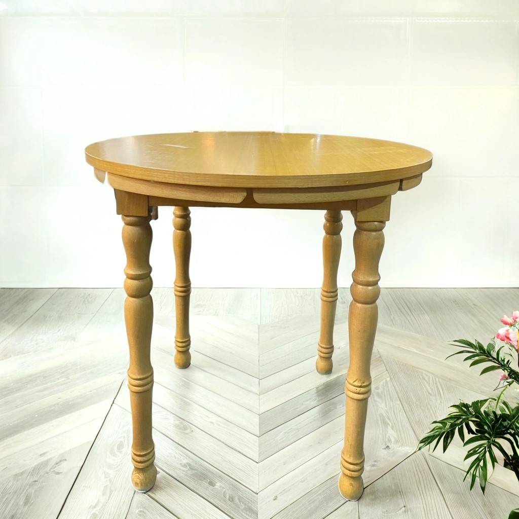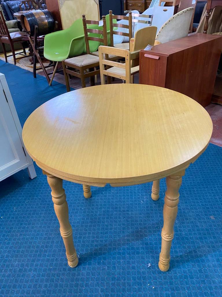 Mesa de comedor con forma redonda que ha sido fabricada con madera de buena calidad y robusta. Se trata de una mesa con cuatro patas que han sido talladas en forma de columnas que la hace resaltar. Es ideal para colocar en un salón comedor o en una cocina. Como podemos observar en las fotografías se encuentra en buenas condiciones.