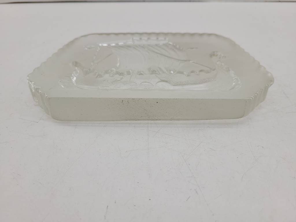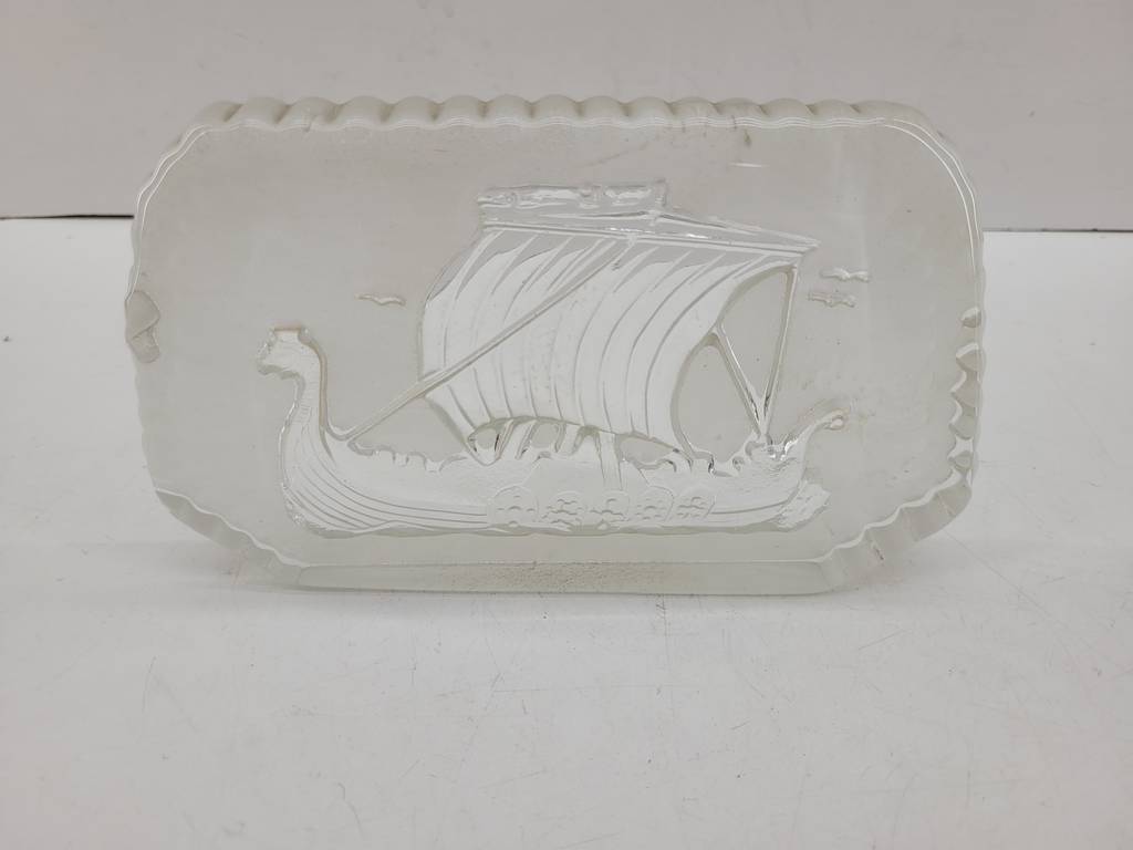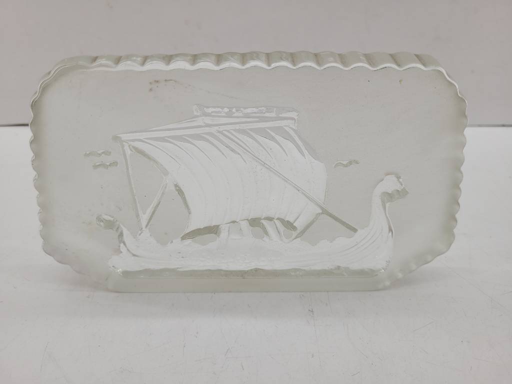Pisapapel tallado en cristal grueso y transparente. Se trata de un pisapapel tallado que tiene una forma rectangular y alargada y lleva un dibujo de un barco velero en la superficie. Es un pisapapel muy elegante que se puede colocar en un estudio o en un salón comedor. Como se puede observar en las fotografías se encuentra en buenas condiciones para ser utilizado.