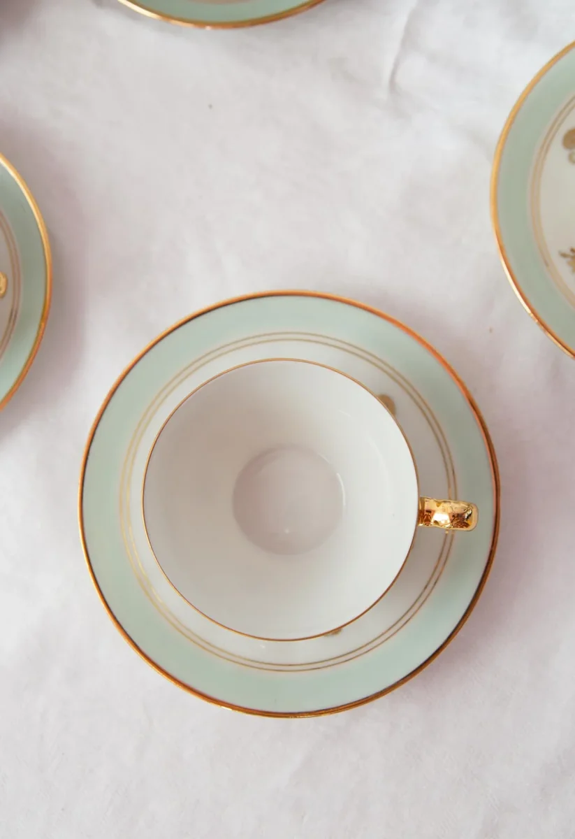 Juego de té o café porcelana francesa Limoges de aprox. 1950s para 12 personas en perfecto estado. El dorado está en un estado fantástico y presenta muy poco uso en general, casi como nuevo. Ideal para dar un toque de color a tus sobremesas y meriendas.