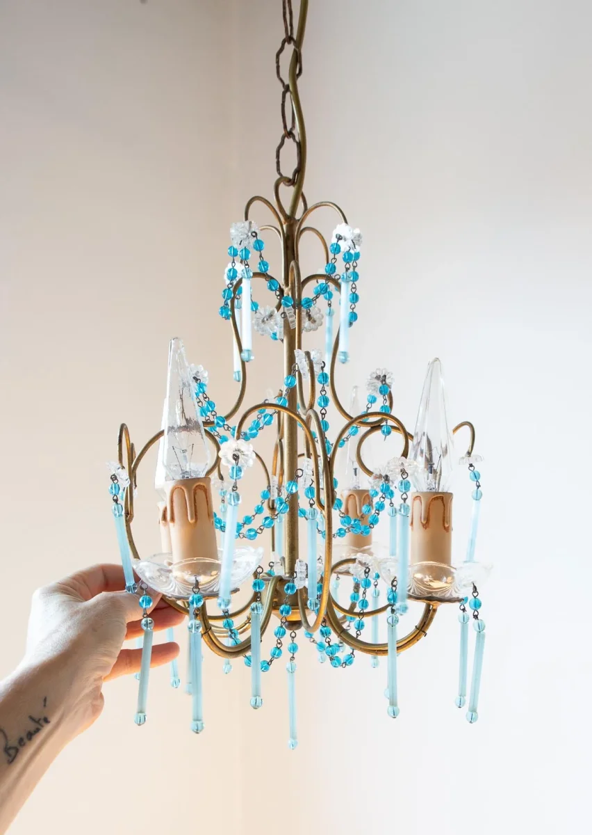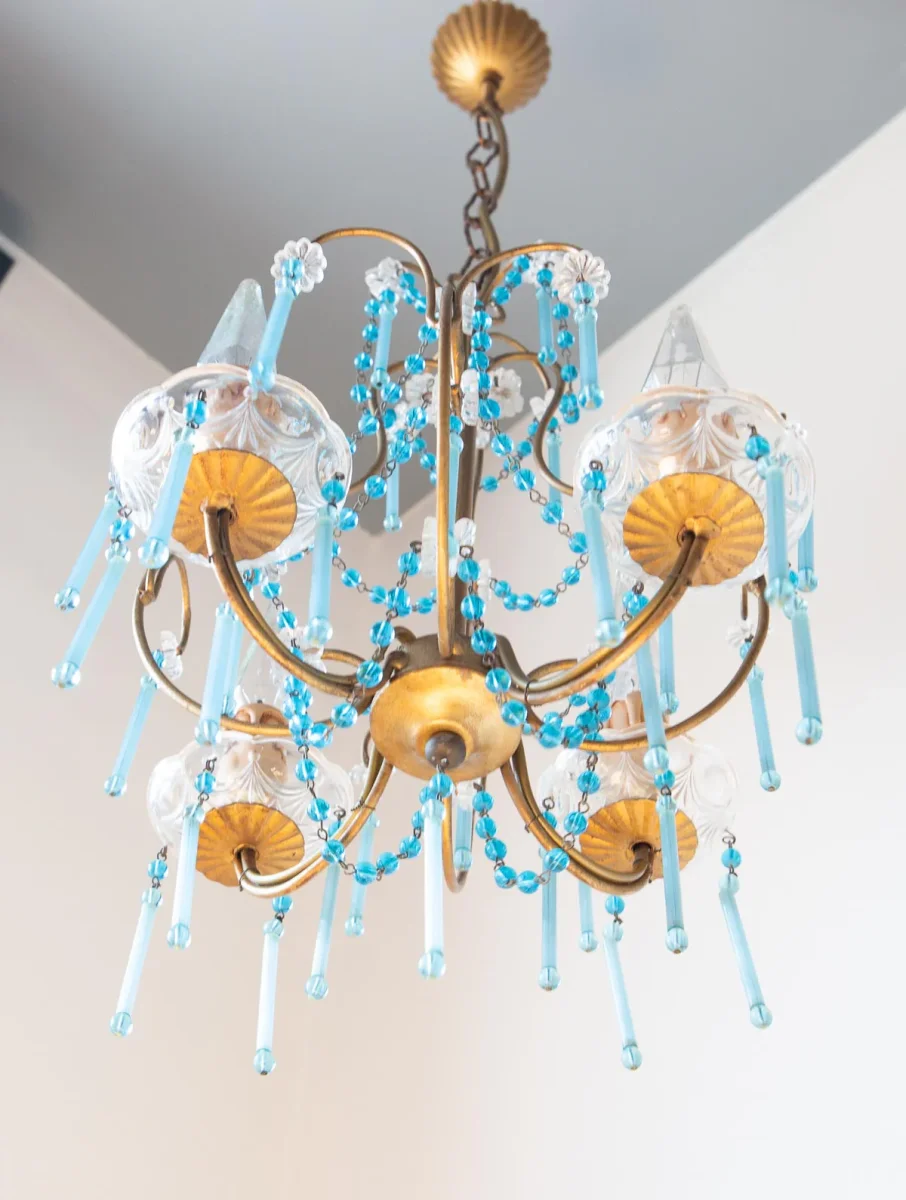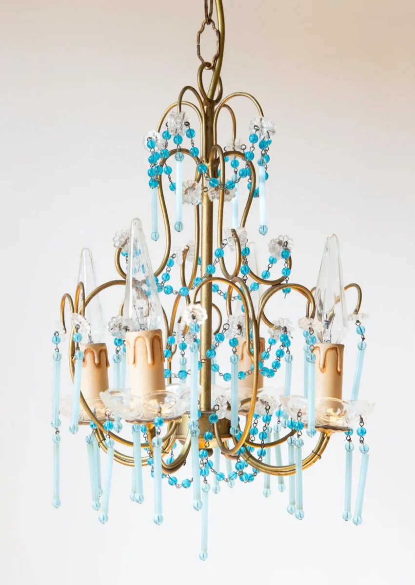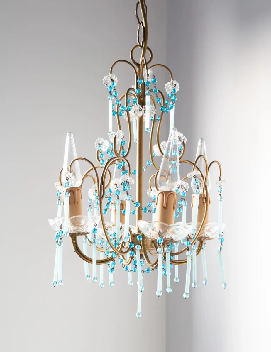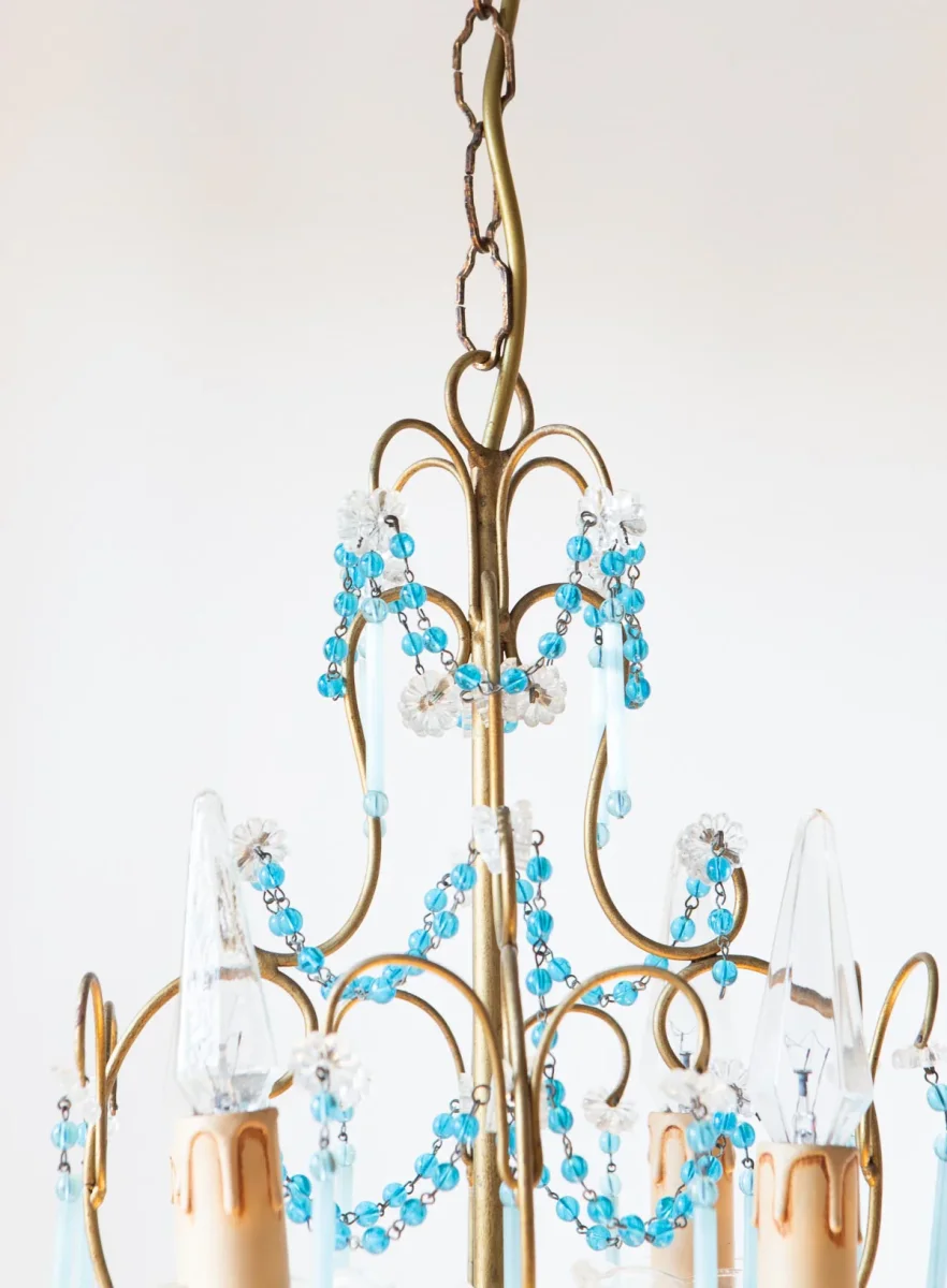 Pequeña araña de techo italiana de metal dorado con unos preciosos cristales azul turquesa con 4 puntos de luz.